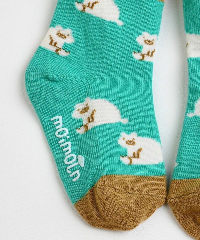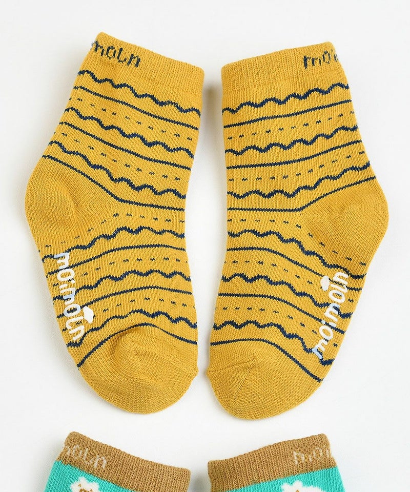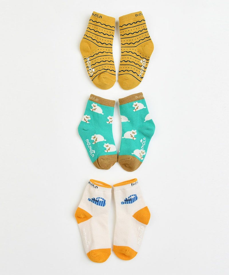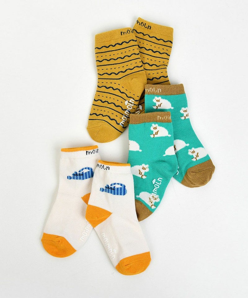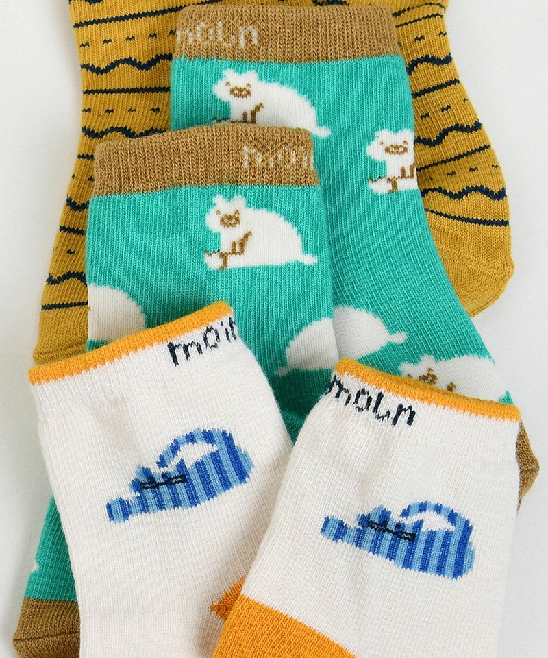 個性あふれる3足SETのひざ下丈ソックス。デザインとしてmoimolnロゴをプラス、足の裏にはブランドロゴの滑り止めがついており、小さなお子様にぴったり。ミントカラー、クマのデリック(derick)、ストライプ、ネコのミャオ(meow)、それぞれ違う魅力を持ったデザインがスタイルに軽快なポイントを加え、カラーの組み合わせが目立つ、そんなデイリールックになれるアイテムです。