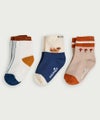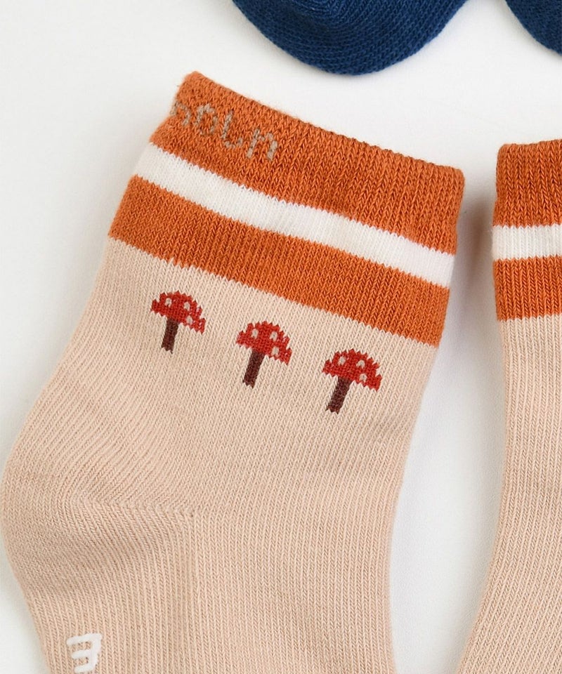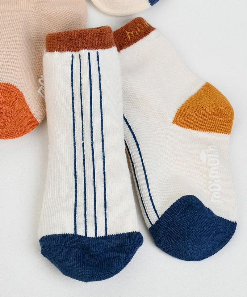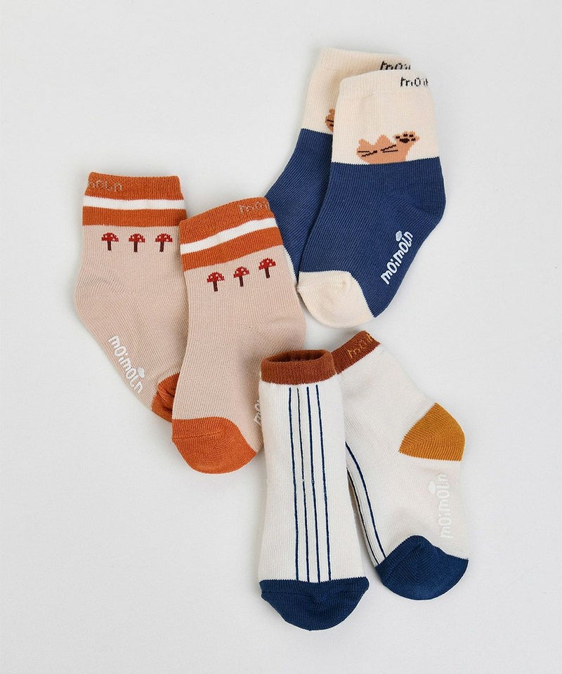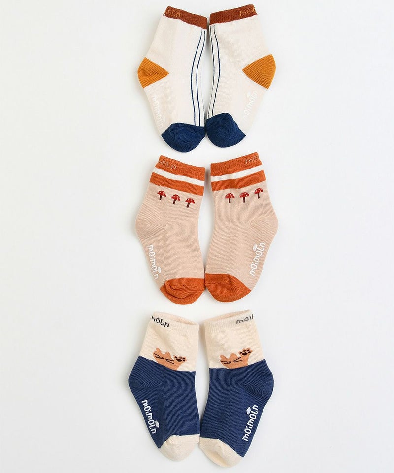 個性あふれる3足SETのひざ下丈ソックス。デザインとしてmoimolnロゴをプラス、足の裏にはブランドロゴの滑り止めがついており、小さなお子様にぴったり。かわいいキノコ、ネコ、ユニークなカラー配色のストライプで構成され、お互い違うムードのデザインが様々なコーデにマッチします。