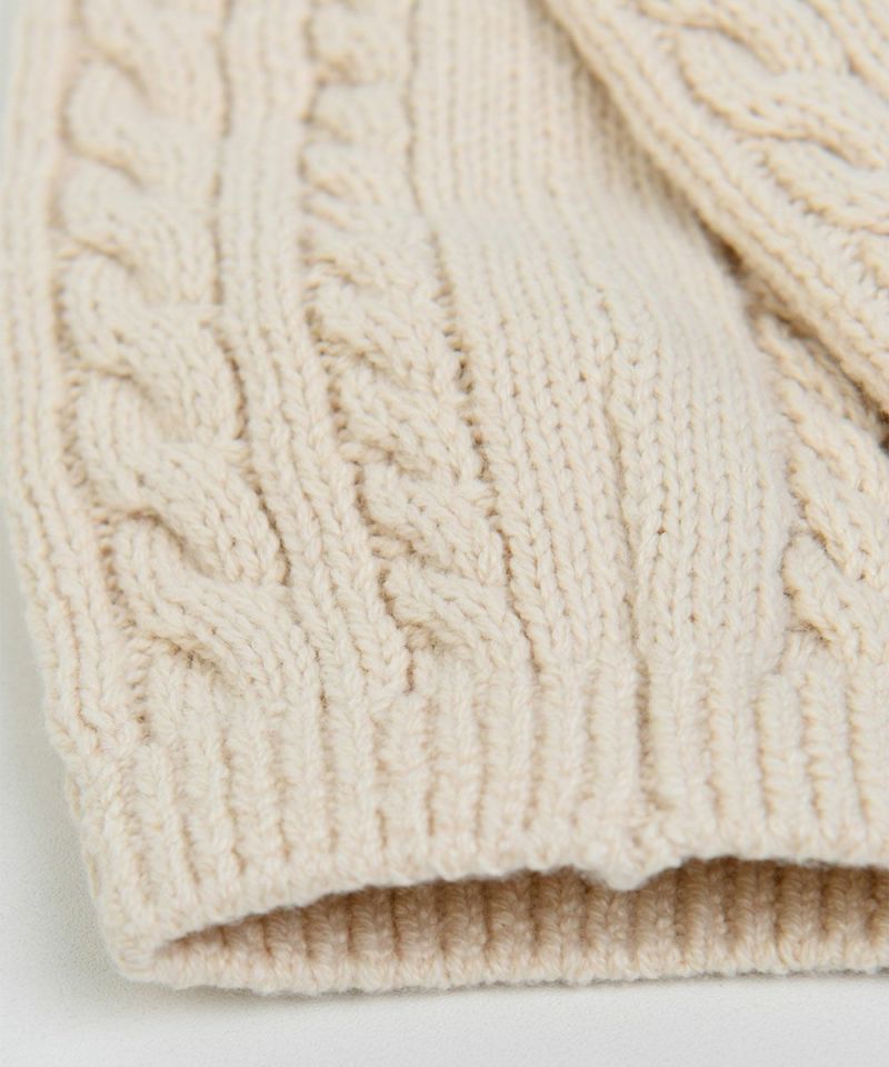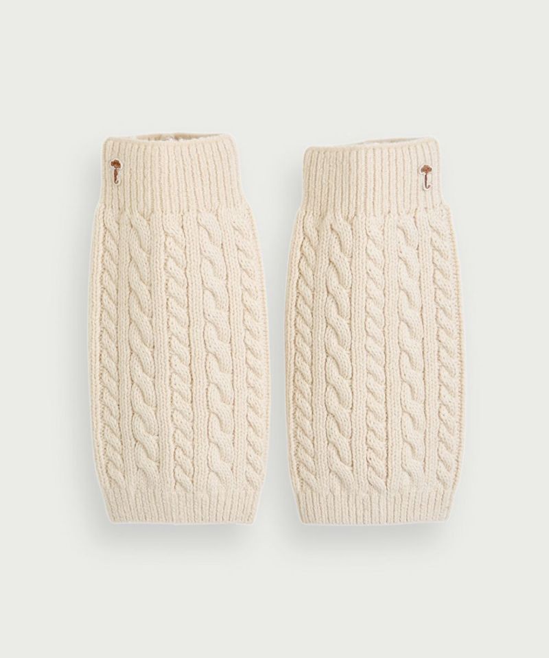 やわらかいタッチ感のアクリル原糸の厚みのあるレッグウォーマー。高い保温性が特徴で、高級なケーブル編みパターンがポイント。さりげないmoimolnマークの刺繍が付いています。