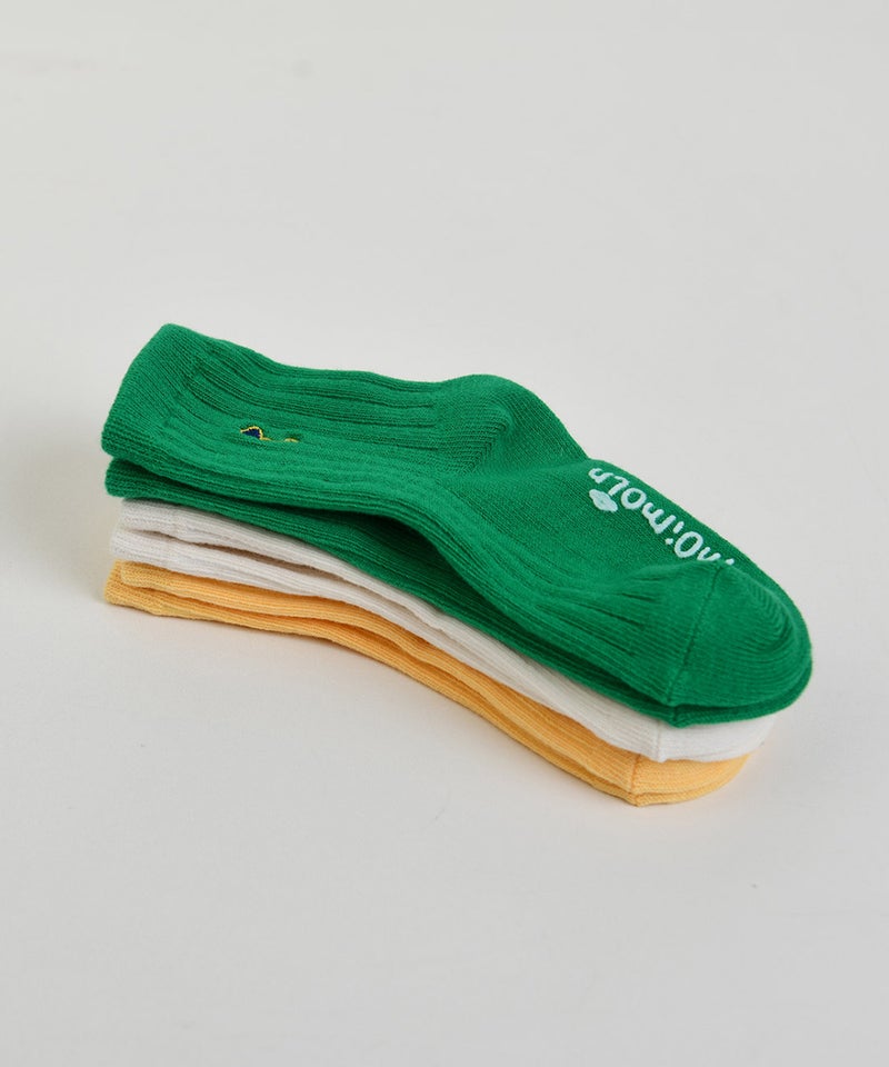 シンプルながらもブランドマークの刺繍をさりげなくプラスしたお得な3色3点セットの靴下。