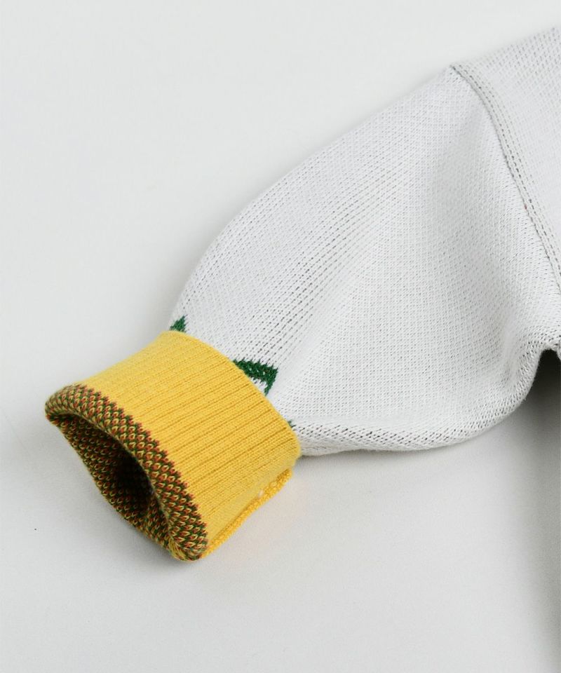ピーマンのグラフィックがユニークなカーディガン。アクリル素材を使用し、やわらかいタッチ感に。一枚羽織るだけでおしゃれになるアイテムです。
