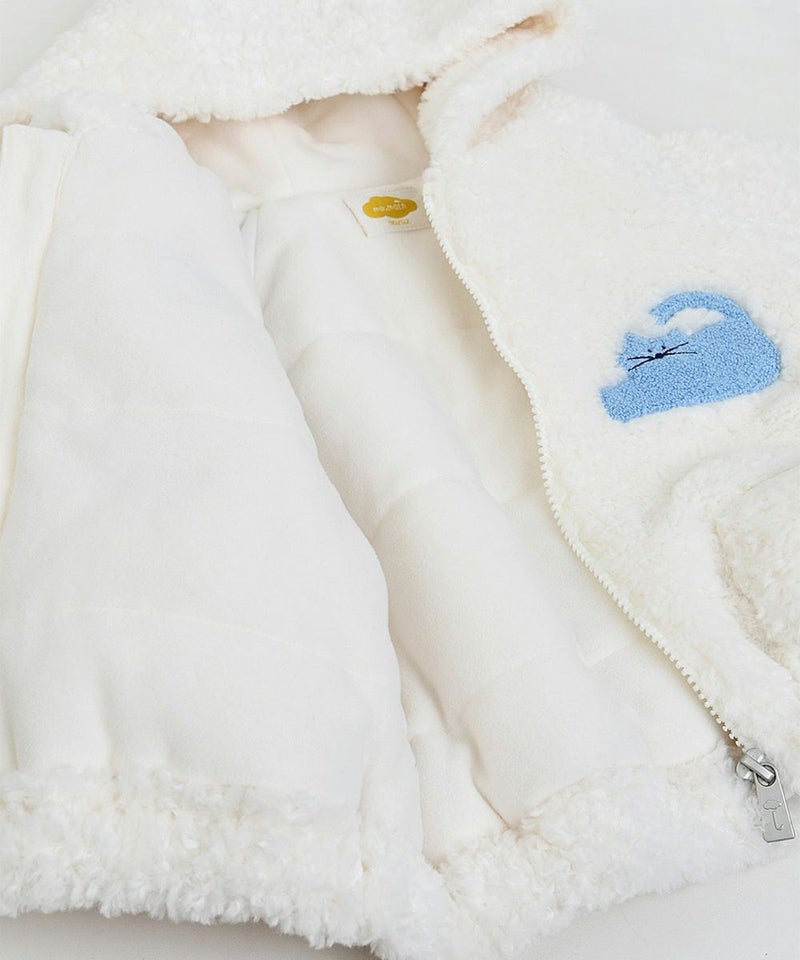 ネコのミャオ(meow)、きのこ、木のブクル刺繍のボアフリースジャケット。柔らかいボア生地に前はファスナーで脱着も簡単、ファスナーガードも付いているのでお子さまにも安心です。裏地まで柔らかいフリースで暖かく、フィット感を感じられるフード付きジャケットです。