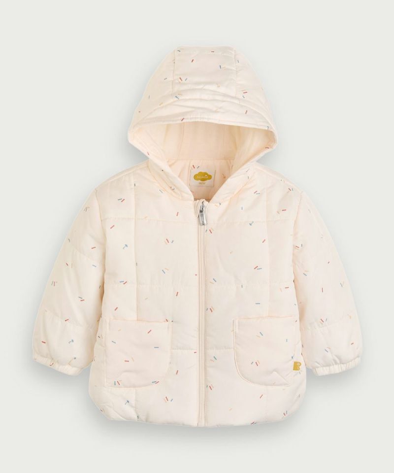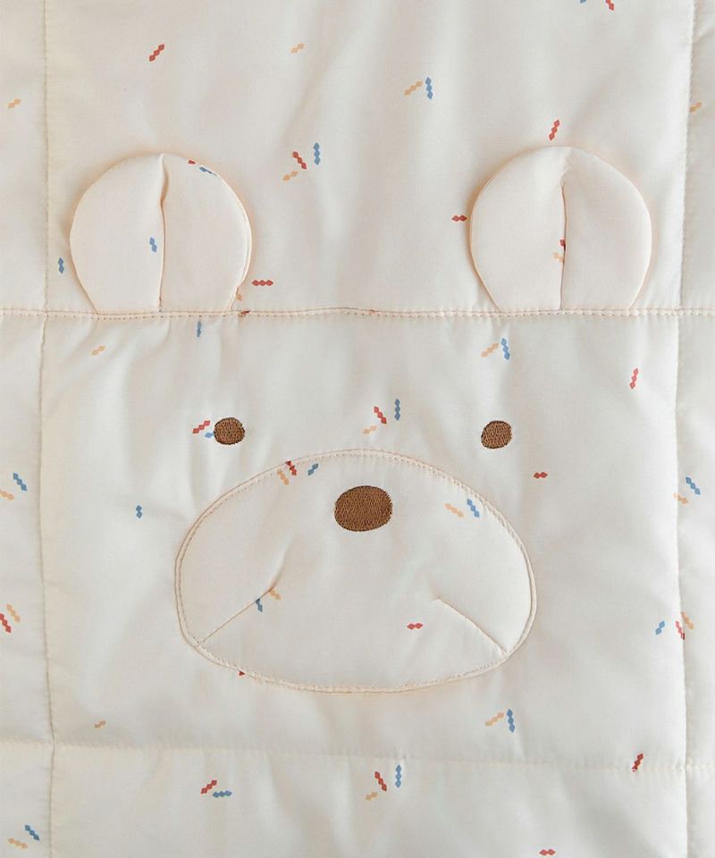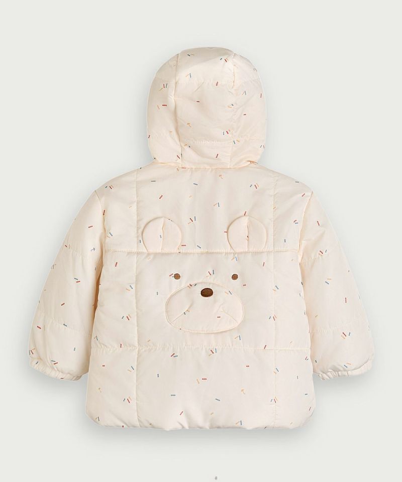 軽く羽織れる軽量パデットジャケット。きれいなアイボリー生地にカラフルなプリントがちりばめられ、フロントには両方にポケット付き。背中にはふっくらとした立体の耳とクマの顔がとってもCute。フロントはファスナーを使用し、内側にファスナーガードを付け、肌への刺激を防止しています。デイリーアウターとしておすすめの中綿ジャケットです。※フードは取り外し不可となります。