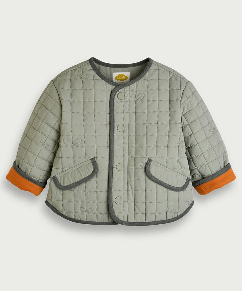 コーデュロイのパイピングを袖や裾側に施した軽くて暖かいキルティングパデットジャケット。小さな新芽の形のキルティングが愛らしい雰囲気をだし、かわいいミニポケットも両側についてます。スナップボタンで子供一人でも手軽に着用できます。ノーカラーなのでインナーを選ばず、どんなルックにも自然にマッチし、冬場、室内外のどこでも活用しやすいアイテムです。