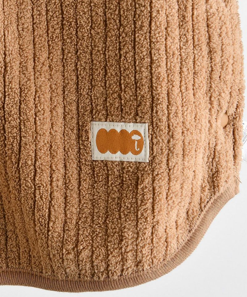 サラサラでソフトな風合いのある、ミンクのような手触りのポリエステルボア生地を両面使用したショート丈のスリーパーベスト。ムードのある落ち着いたトーンのブラウンとピンクカラーで様々なアイテムとマッチ、ルームベストとしてもおすすめです。両脇のスナップボタンで脱着も簡単、赤ちゃんの快適な眠りをサポートします。