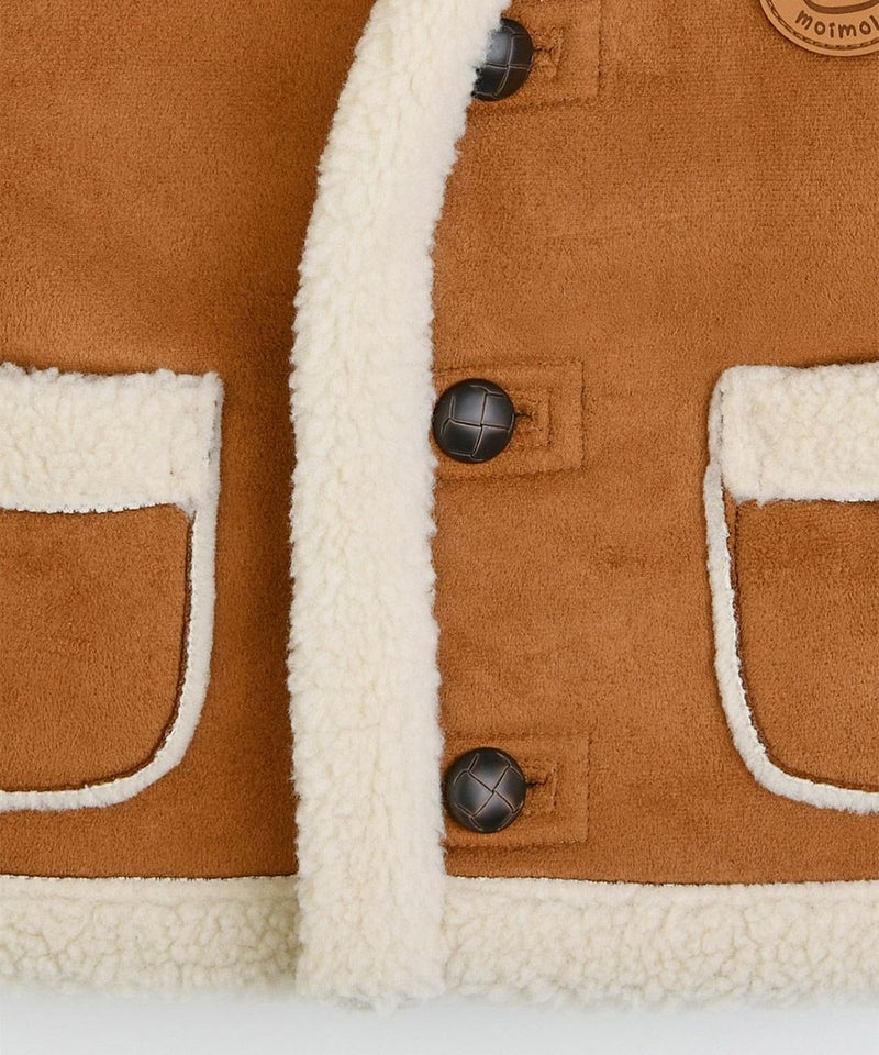 キャメルカラーのフェイクムートンに柔らかいボアの配色がおしゃれなノーカラーベスト。フロントには可愛いネコのワッペンで取り外しが可能。背中には可愛らしいブークル刺繍の大きなネコ、フロントの立体感のあるボタンもポイントになっています。この季節に合わせやすいカラー配色のため、さまざまなコーディネートとの相性もばっちりです。※両側にポケットが付いています。* 素材の特性上、熱に弱いためお湯と乾燥機の使用を避け、軽い汚れは部分洗濯をお勧めいたします。