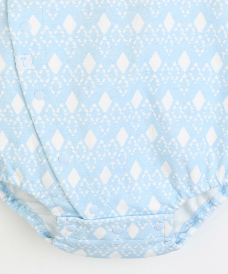 ライトブルーのダイヤ柄を全体にプリントし、エレガントさをプラスしたボディスーツとレギンスのセット。大きなセーラーカラーの襟元に同系色のダイヤ柄のポイントをほどこし、袖や裾はリブで優しくフィット、スナップボタンでお着替え簡単です。季節や気温に合わせてシンプルなストレッチレギンスを合わせてのコーディネートもぴったり。コットン素材の商品は、着心地・肌へのやさしさ・快適性に優れた、毎日着たくなる安心素材です。お子さまのデイリーウェアとしてはもちろん、ギフトにもおすすめのセット商品です。