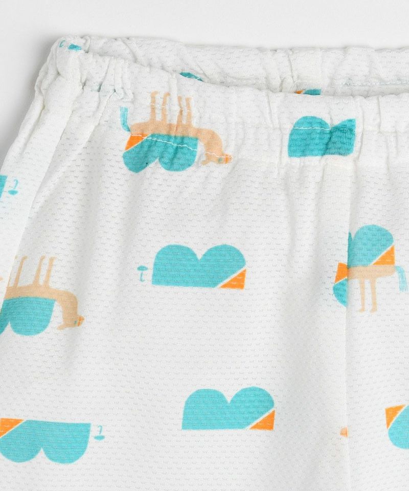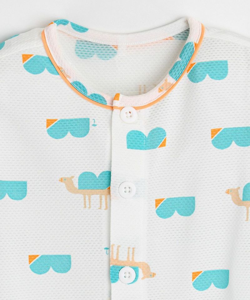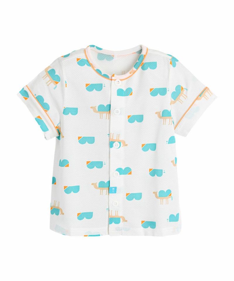 通気性に優れ、涼しく体に付きにくいレーヨンメッシュ生地の半袖ルームウェア。かわいいラクダのプリントがポイントで、ブルーグリーンとオレンジのカラー配色がモイモルンらしさを出しています。ベビーギフトとしてもおすすめです。