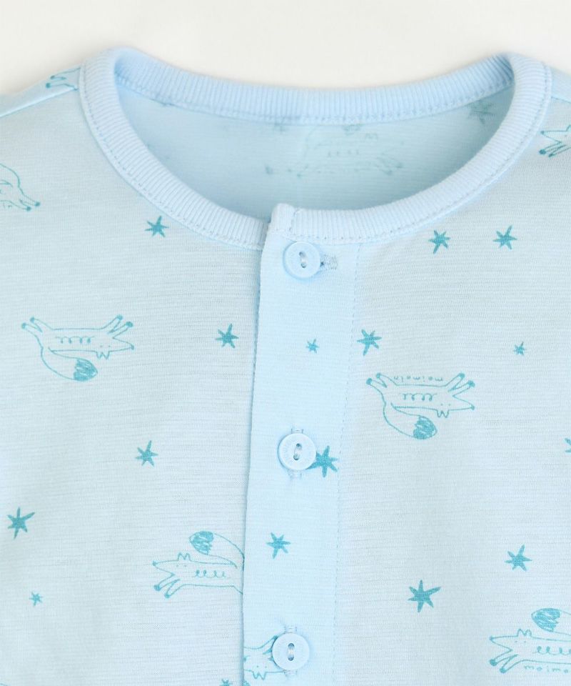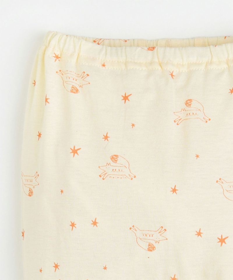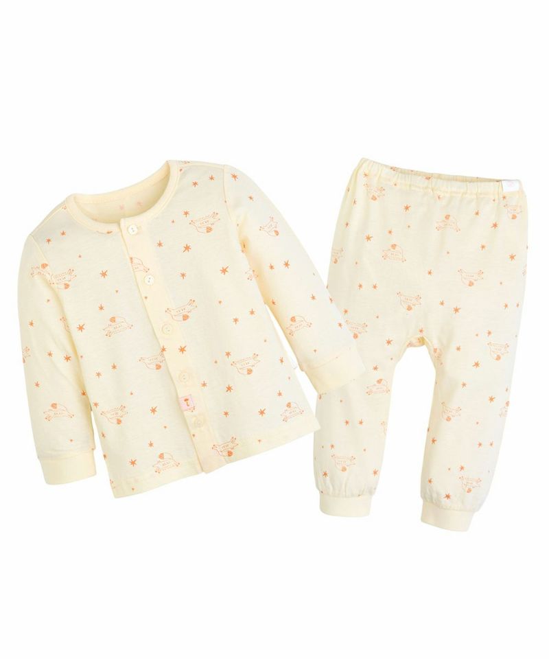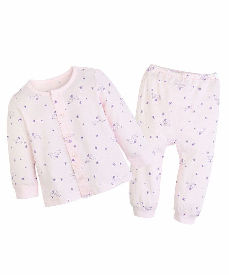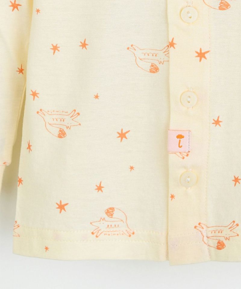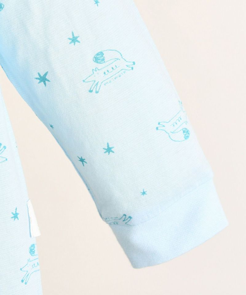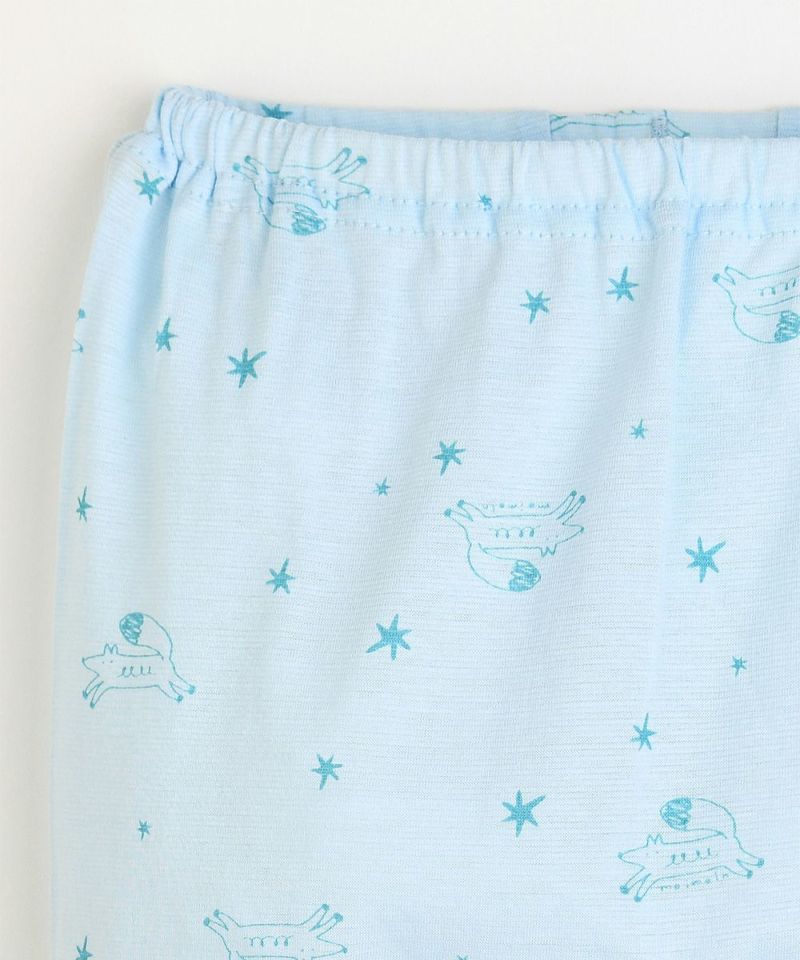 まるで星空を駆け巡るキツネのネロの総柄がかわいい、淡いカラーの長袖トップスとロングパンツのルームウェア。コットン100%で吸水性・通気性に優れた綿素材で、寝汗もさらっと通し、寝起きも快適です。サイズによって糸付きボタンの有無、ボタンの配置位置のデザインが異なります。