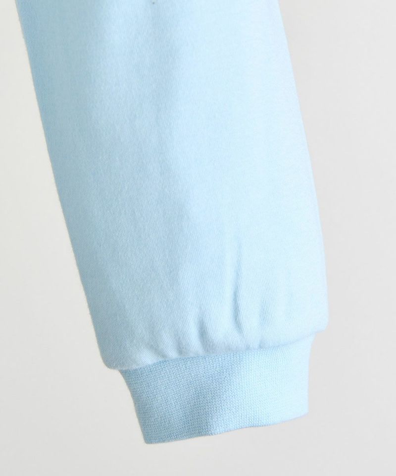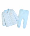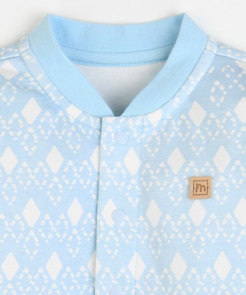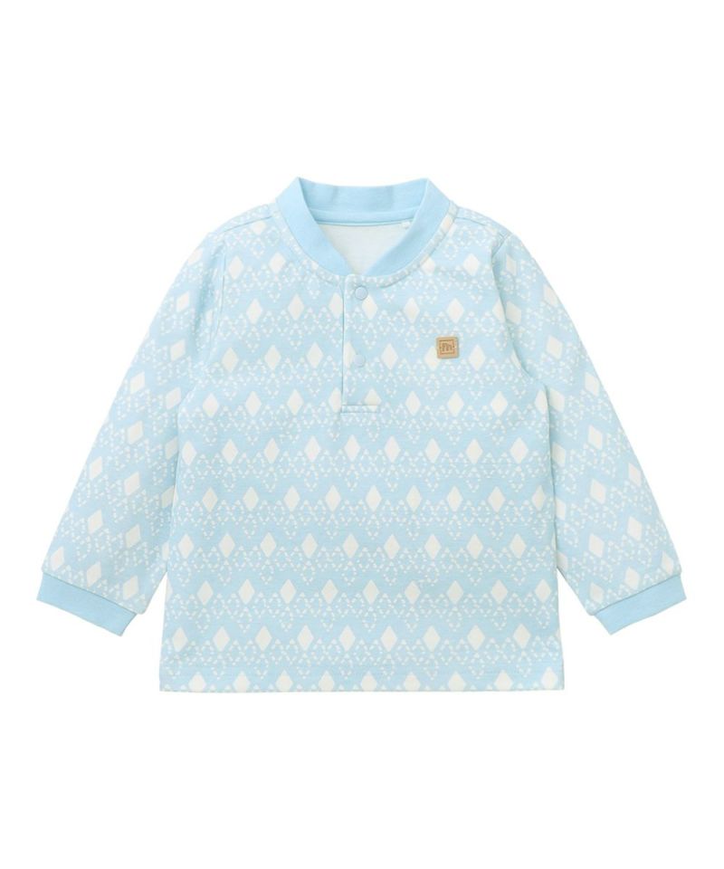 ライトブルーのダイヤ柄を全体にプリントし、エレガントさをプラスした長袖トップスとロングパンツのルームウェア。すっきりとした襟元に、袖や裾はリブで優しくフィット、胸元にはさりげなくブランドロゴ頭文字プレートを付けています。スナップボタン付きで、脱着もスムーズにおこなえます。コットン素材の商品は、着心地・肌へのやさしさ・快適性に優れた、毎日着たくなる安心素材です。お子さまのルームウェアとしてはもちろん、ギフトにもおすすめの商品です。