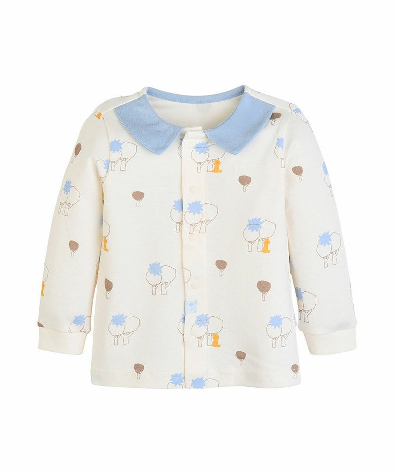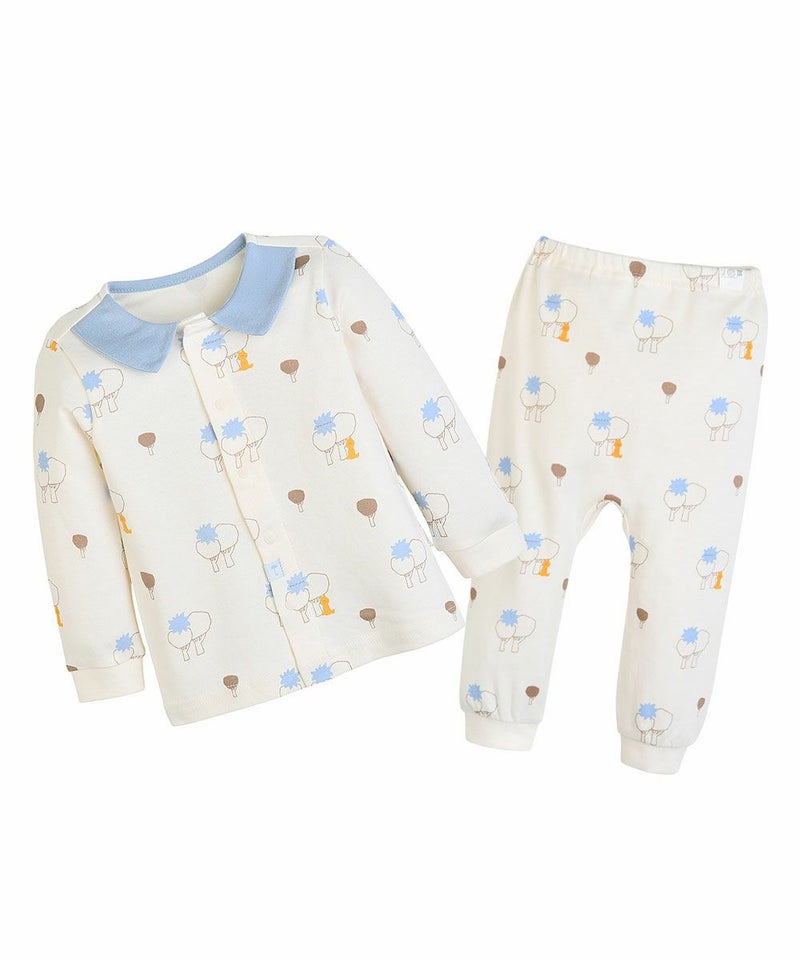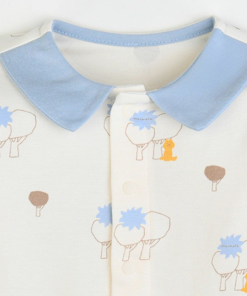吸湿性にも優れ、素肌にやさしい滑らかな肌ざわりが特徴のレーヨン生地を使用した長袖トップスとロングパンツのルームウェア。さわやかなブルーの襟に、クマのデリック(derick)が森にたたずむプリントがCute、スナップボタンでお子さまの着替えも簡単にできます。お子さまのルームウェアとしてはもちろん、ギフトにもおすすめの商品です。