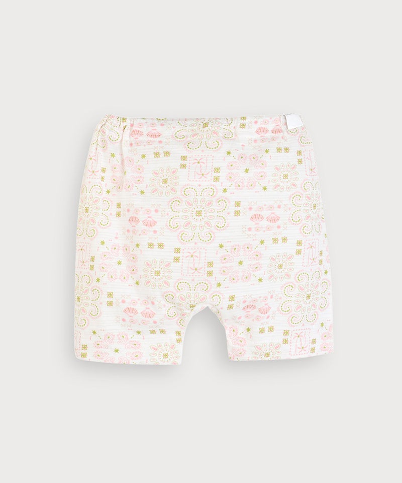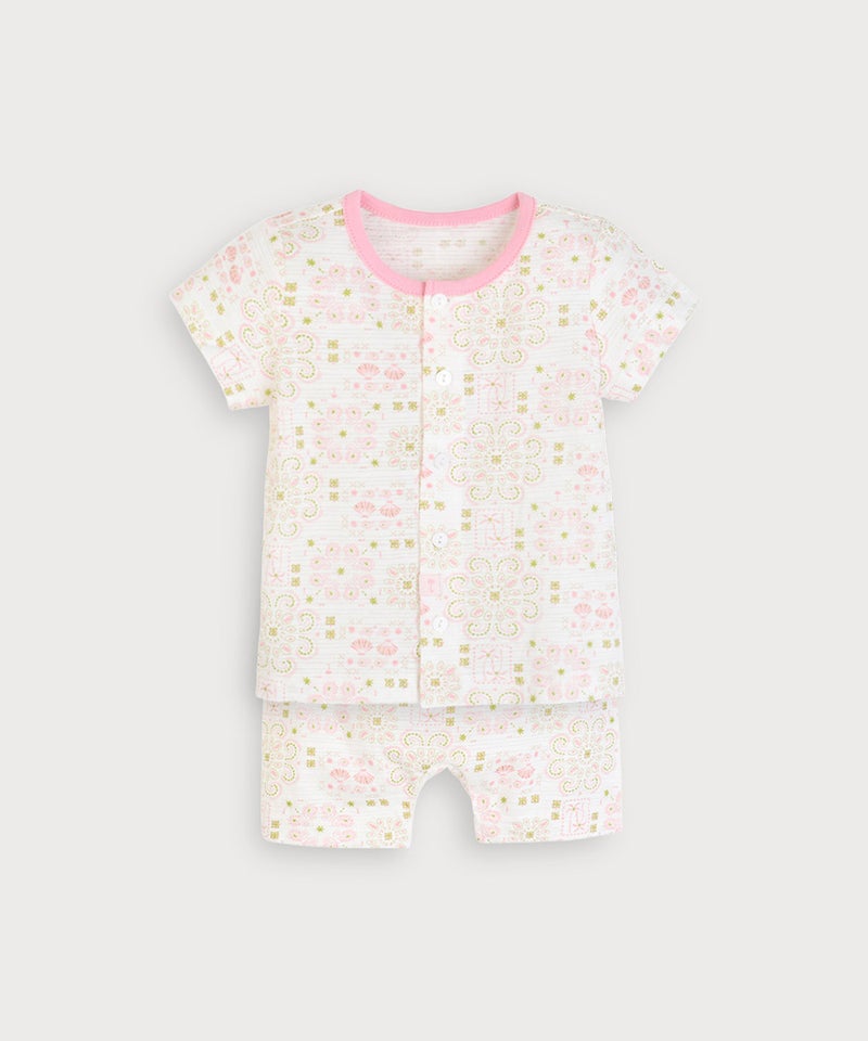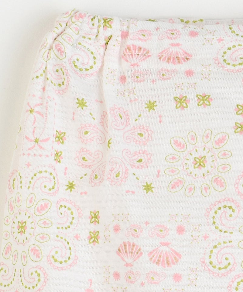 ペイズリーと貝殻のMIX柄がポイントの半袖トップスとパンツのセット。