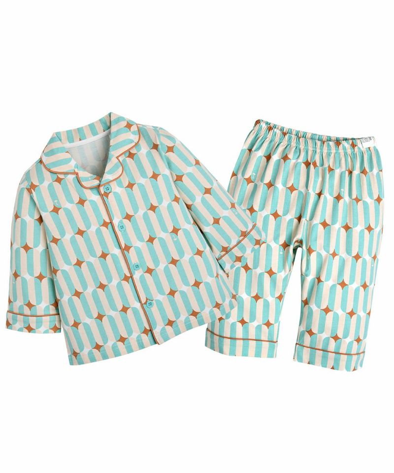 幾何学モチーフのプリントモダールコットンパジャマです。肌触りもよく、ストレッチ性があり動きやすいアイテムです。