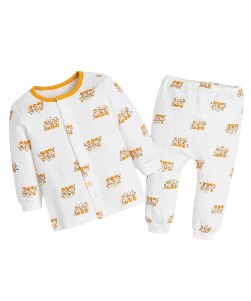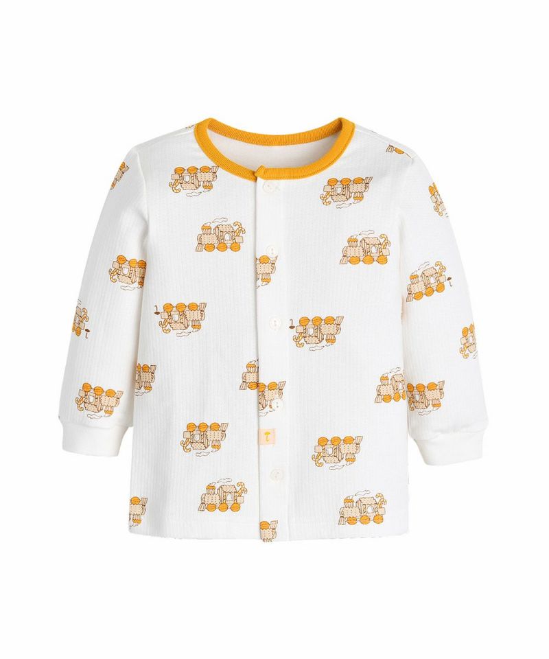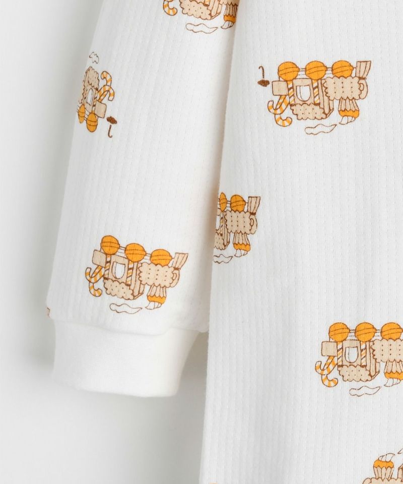クッキーの汽車のグラフィックがデザインされたルームウェア。首元のカラー配色がポイントのアイテムです。