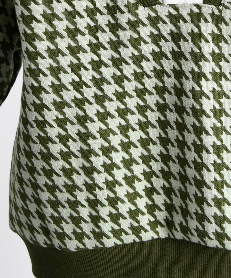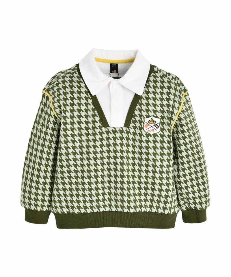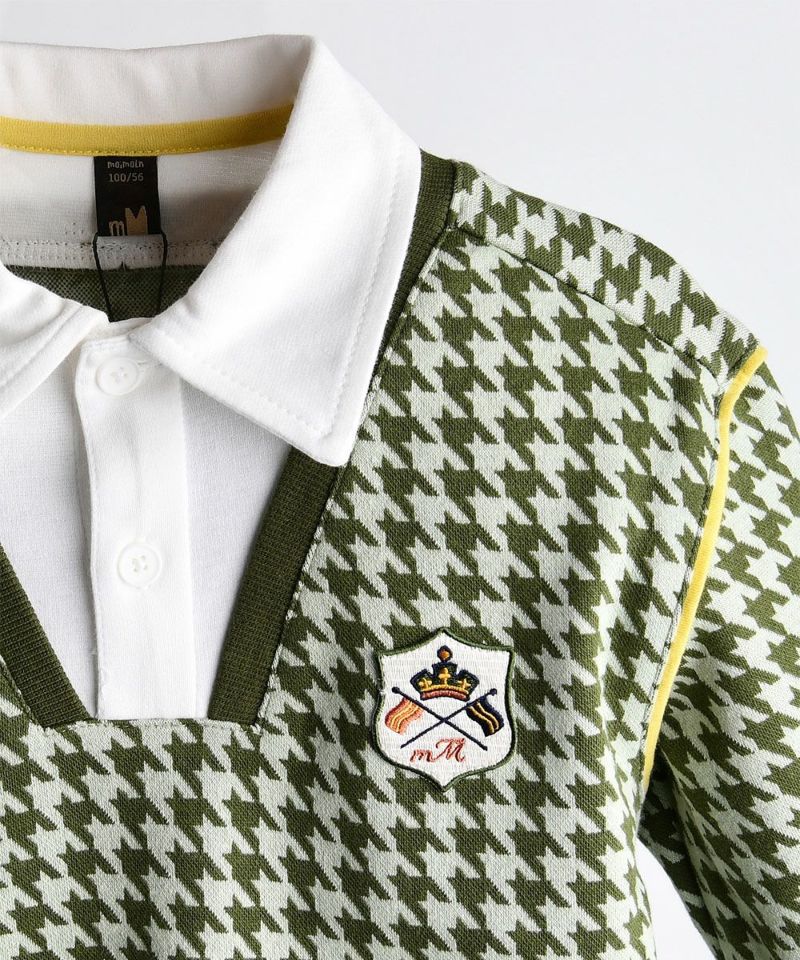シャツレイヤード型トップスと6分丈のショートパンツのセット。クラシカルなハウンドトゥースに襟の組み合わせが端正でおしゃれなアイテム。【セットアップ】エミリーハウンドチェックベスト&パンツ(M241STG45P)と兄妹ルックがおすすめです。