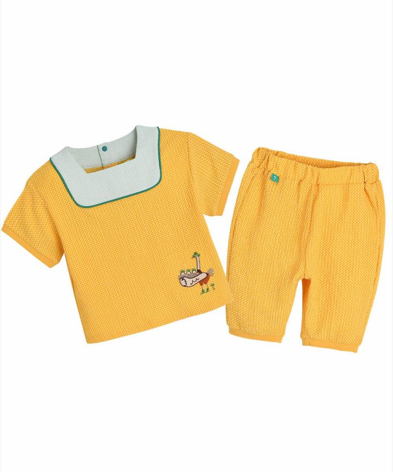 かわいいイエローとさわやかなグリーンカラーがポイントのセットアップ。トップスは4分丈袖で、ボトムは7分丈となっており、大きい刺繍がユニークなアイテムです。
