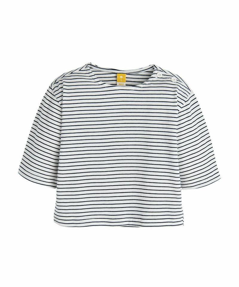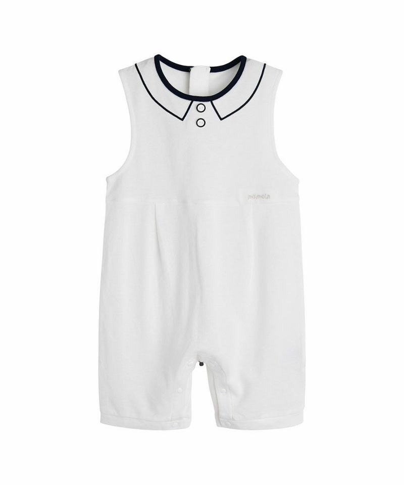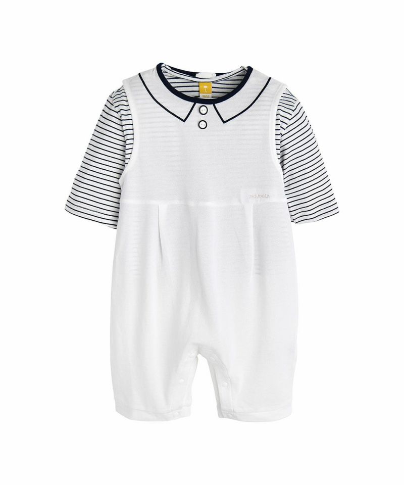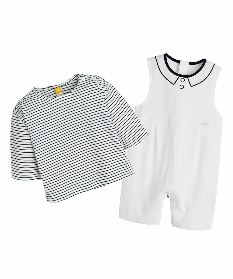 オーバーオールと7分丈Tシャツのセットアイテム。フロントの襟デザインがポイント♪爽やかな印象で夏のお出かけルックとしてもおすすめのアイテムです。