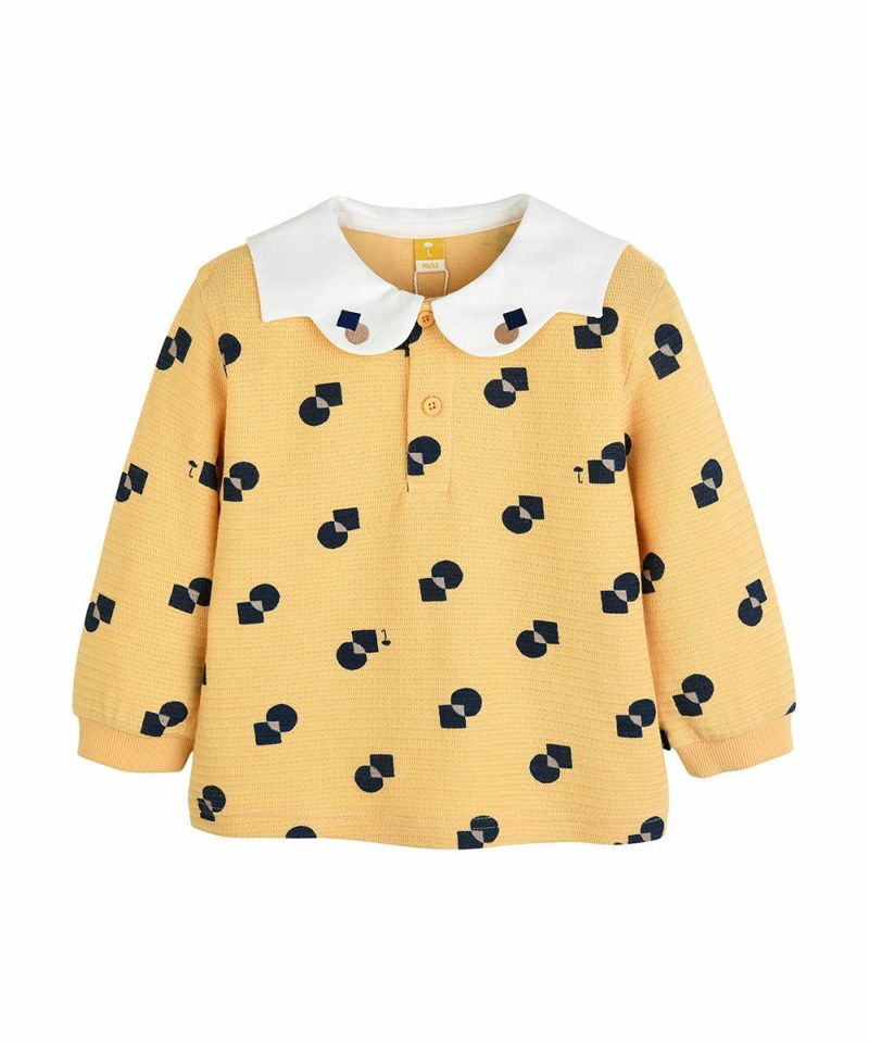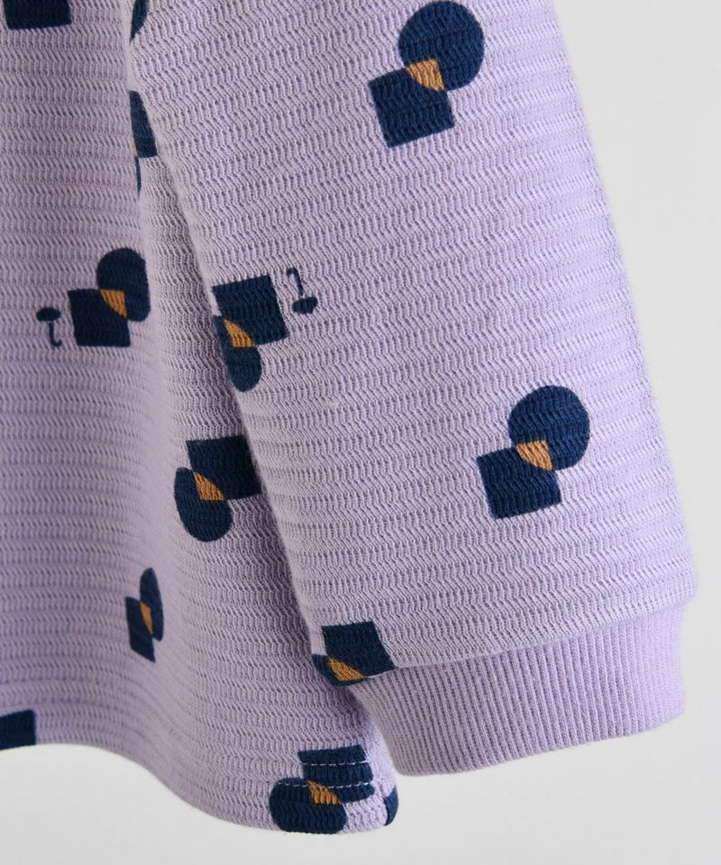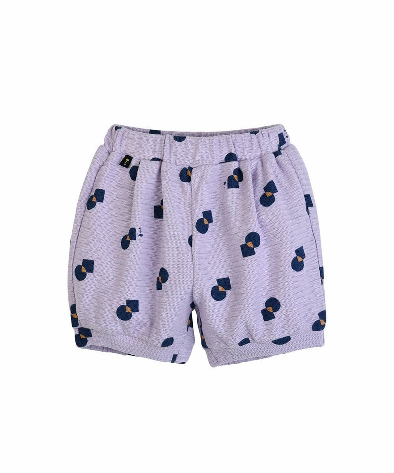 幾何学の様な図形パターンを使用した厚みのある素材感のジャカード生地の長袖トップスとブルマパンツのセット。襟のユニークな形とサークル刺繍がポイントで、ムードのあるイエローとパープルのカラートーンがポップながらもクラシカルな雰囲気を醸し出すアイテム。トップスはフロントにボタンが付いていて脱着も簡単。ワンピース(M253OPB02P)と兄妹ルックがおすすめです。