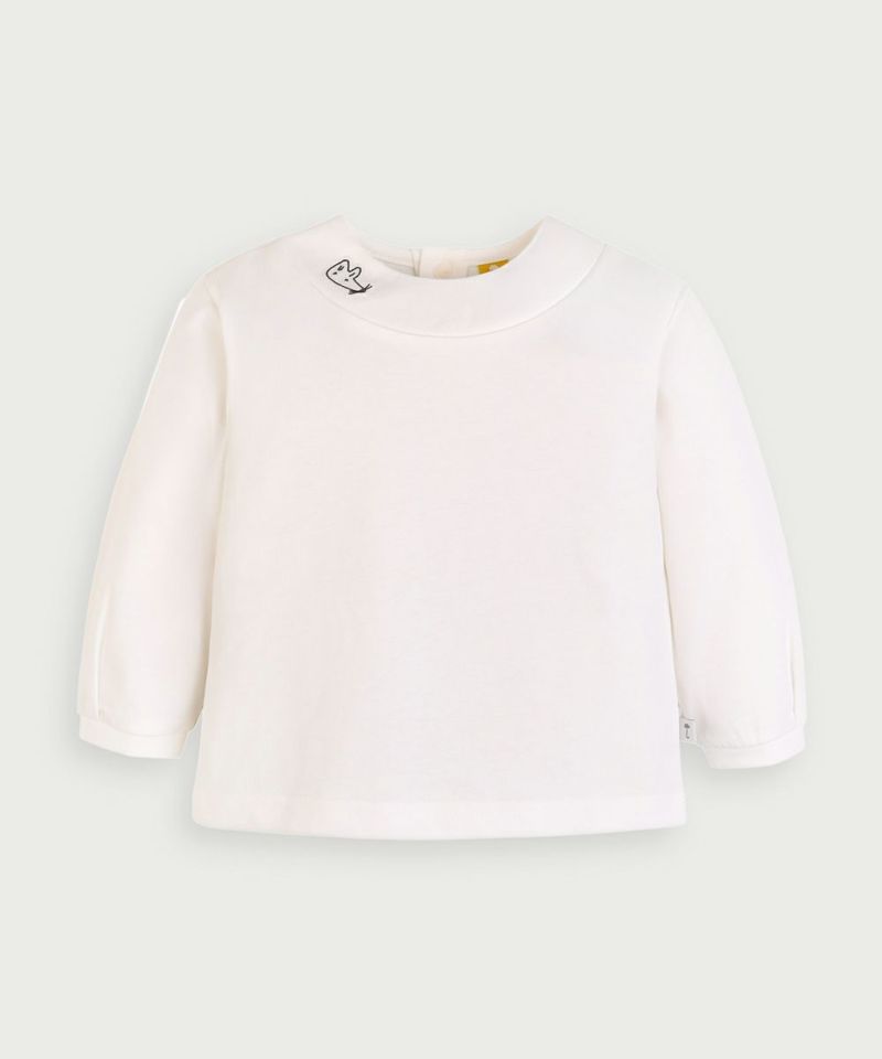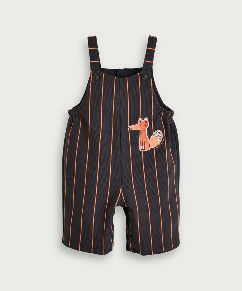 ハイネック長袖トップスとゆったりとしたフィット感の7分丈オーバーオールのセット。肌触りがよく耐久性に優れた素材のトップスは首元にキツネのネロの刺繍入り、背中のスナップボタンで脱着も簡単。オーバーオールは股下はスナップボタン、背中はファスナー付きで脱着しやすく、内側にファスナーガードを付け、肌への刺激を防止しています。差し色としてオレンジのハット(M253CAI02P)と一緒にコーディネートすることがおすすめです。