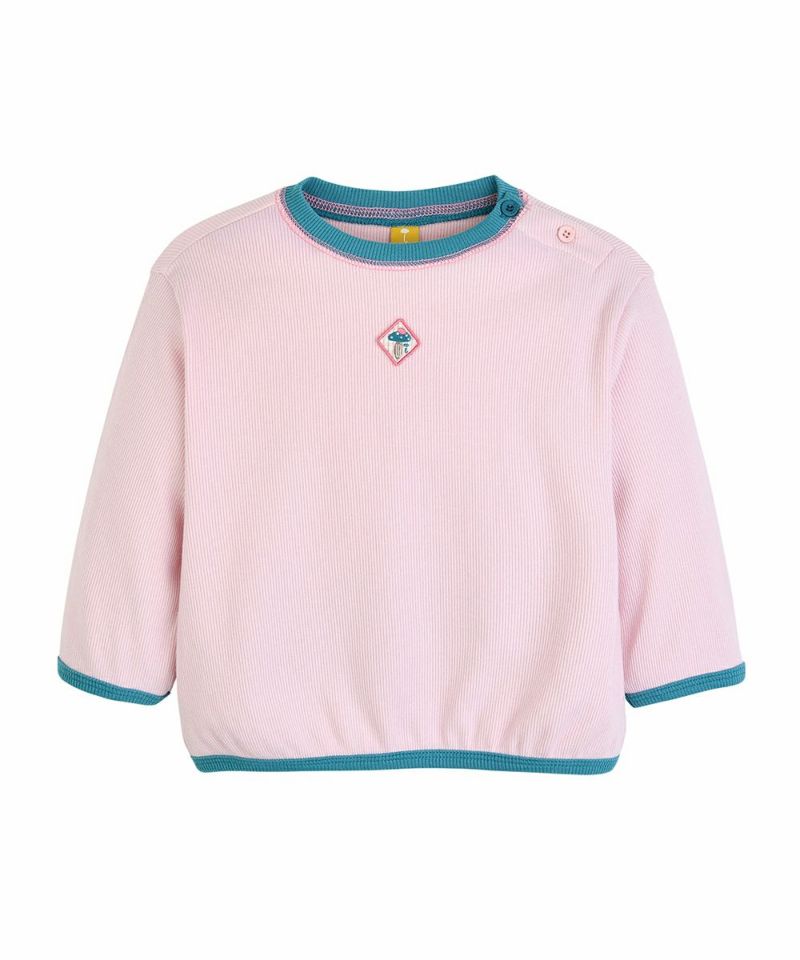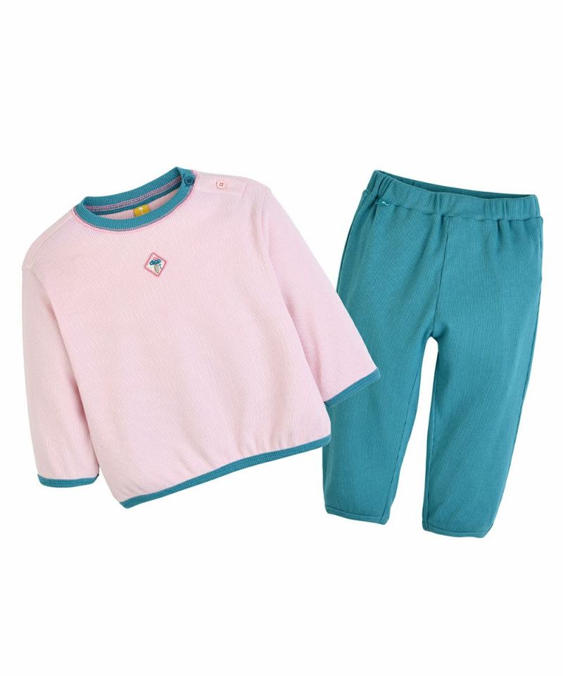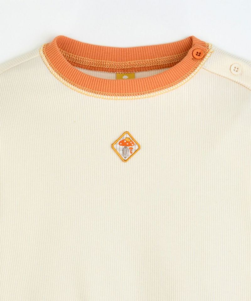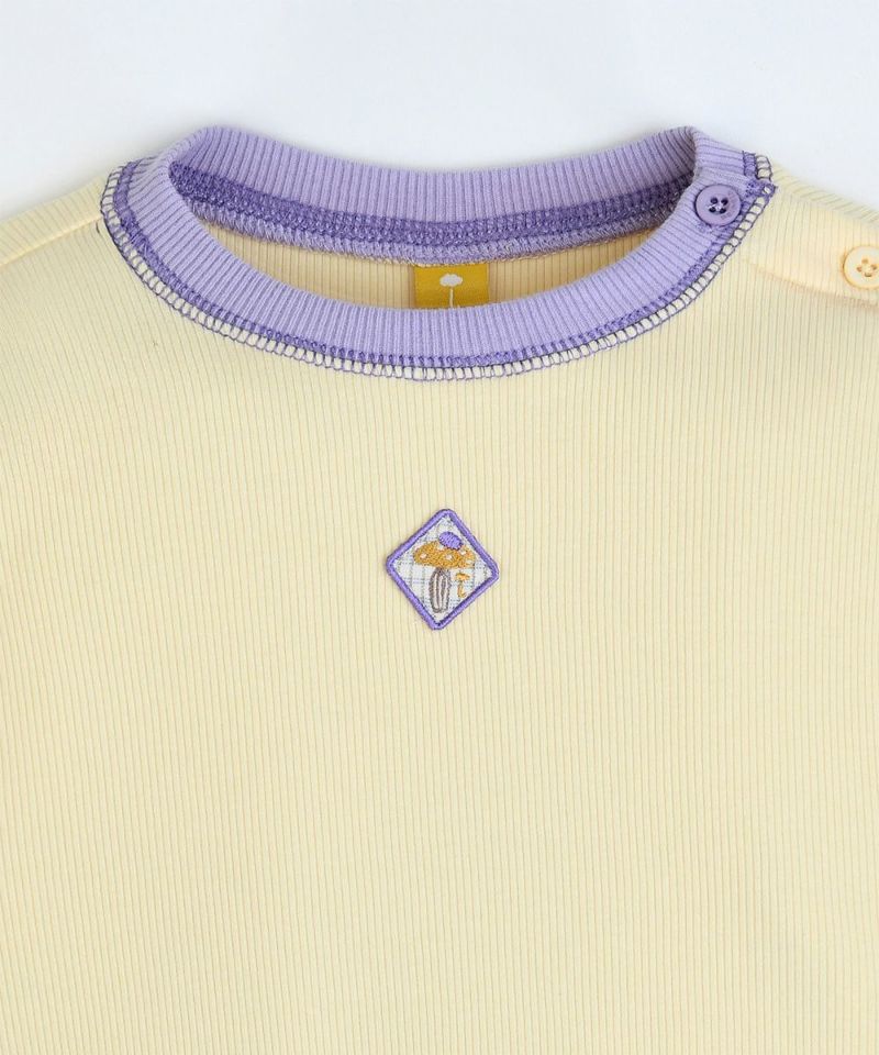 パイピング配色がキノコ刺繍ワッペンの色とよく合うシンプルながらもカラー使いがかわいい長袖トップスとロングパンツのセットアップ。伸縮性に優れたリブ生地で、ルーズフィットで着回しもしやすいアイテムです。*80-100 : 肩開き*110-120 : 開きなし