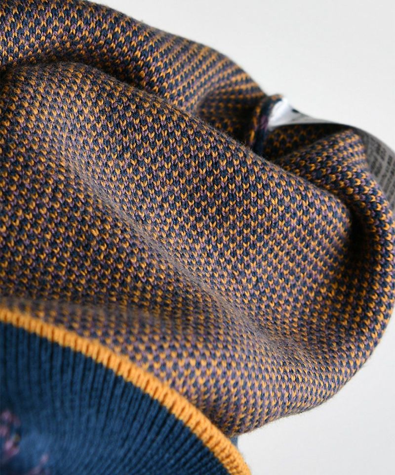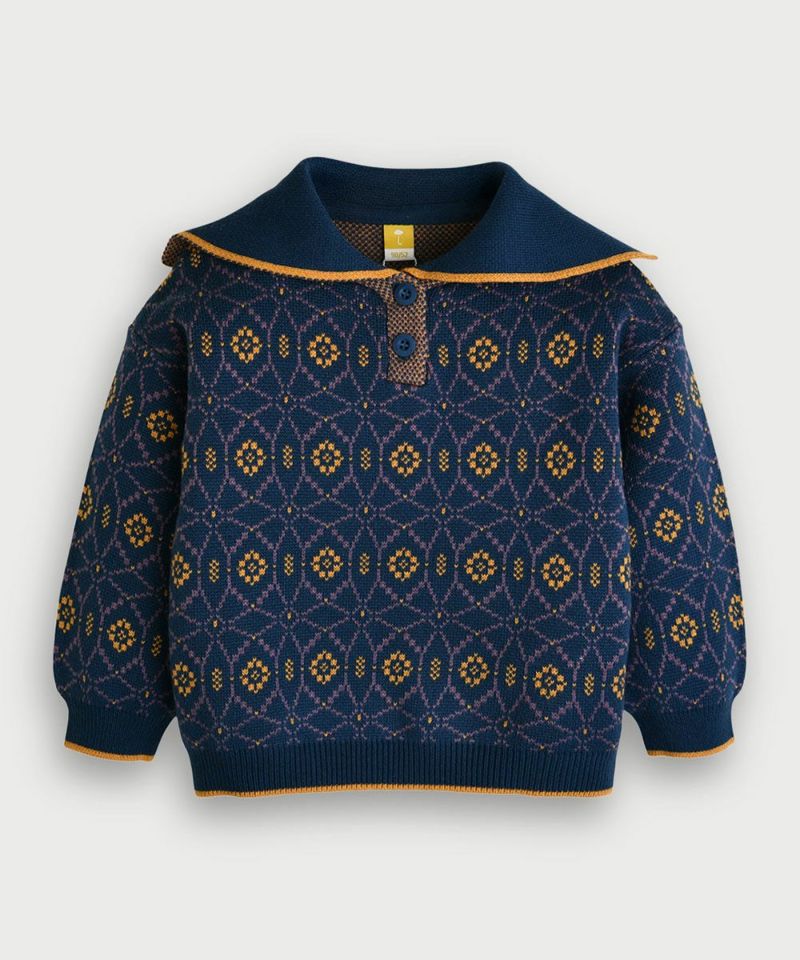 ネイビーにイエローの幾何学的な模様のパターンが目を引くニットの長袖トップスとハーフパンツ。大きなセーラーカラーがポイントで、胸元のボタンで着脱がしやすいトップスと、ボトムスは膝上ぐらいのハーフパンツ。