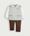 ベストをレイヤードしたような長袖トップスとロングパンツのセット。トップスは襟付きでレイヤーのデザインがおしゃれ度をアップさせ、袖は同系のカラーの木の模様がなんともCute、裏起毛で暖かさもあります。フロントの両ポケットにはさりげないカラーラインでのステッチ付き、ボトムスはウエストゴムとゆったりフィットのロングパンツなのでお子様でもお着換えが簡単にできます。※サイズによって首元に脱着用のボタン開閉があります。
