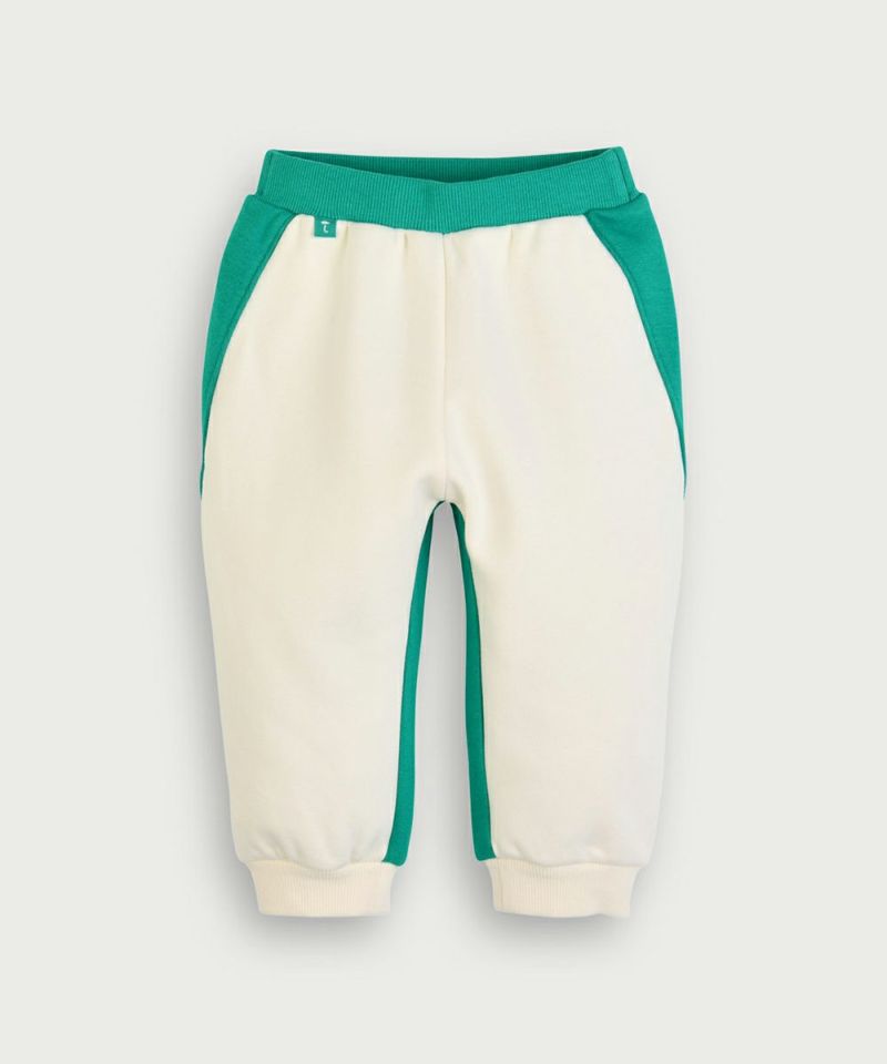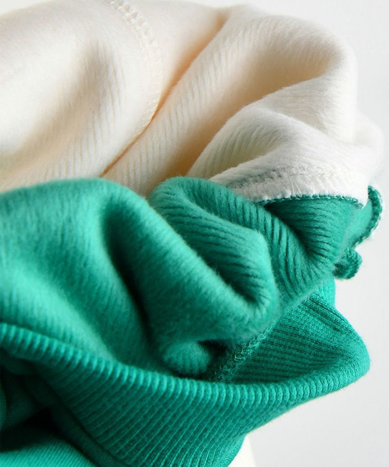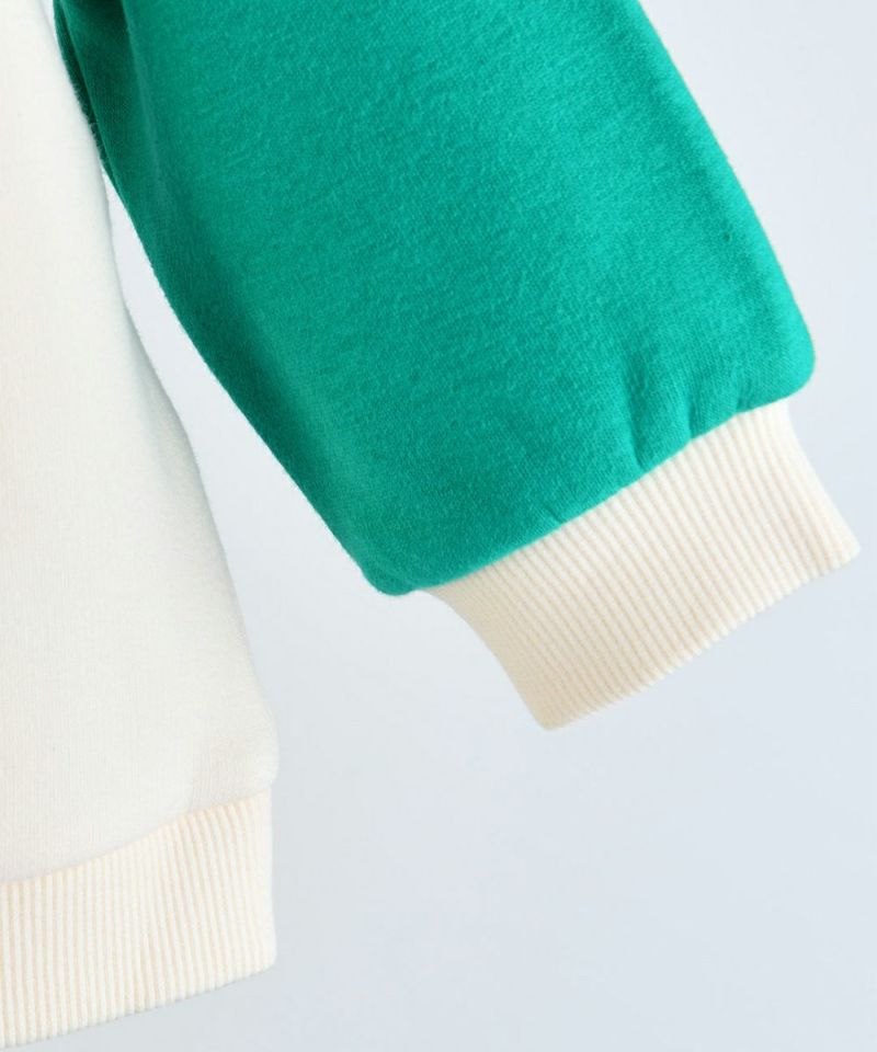 グリーンとクリームの2トーンのカラー配色がポイントの長袖トップスとロングパンツのセット。長袖トップスフロントのネコのミャオ(meow)刺繍や首元の二重デザインがアクセントに。ボトムスもカラー配色がカジュアルながらもおしゃれ度が高く、前後のカラー配置が異なるのもポイントです。※サイズによって脱着の為のボタン開閉があります。