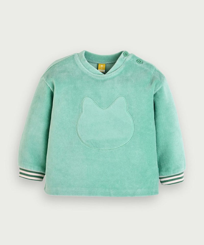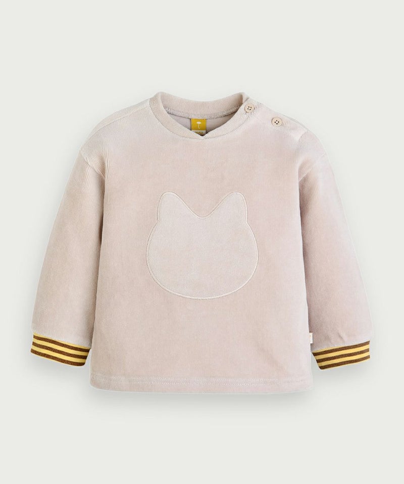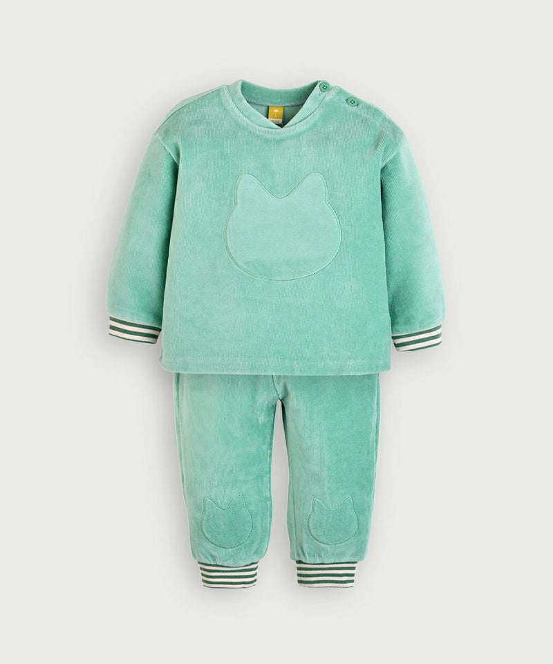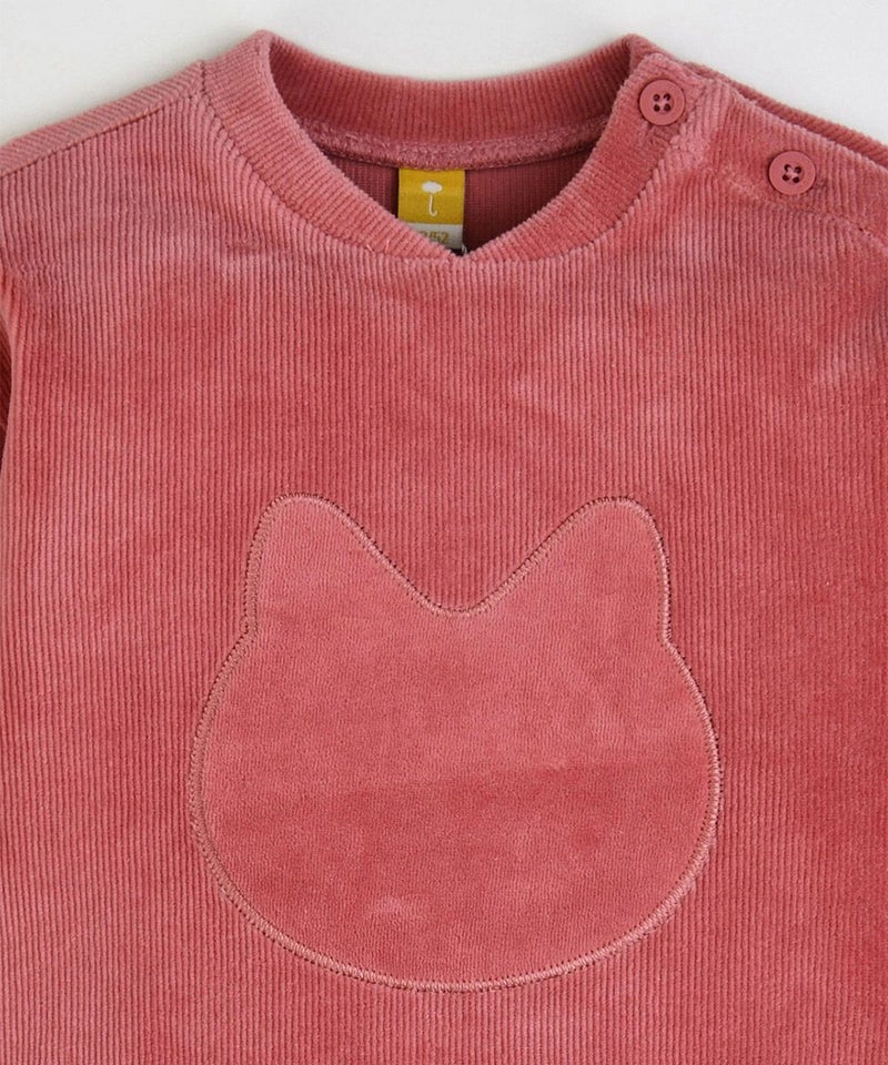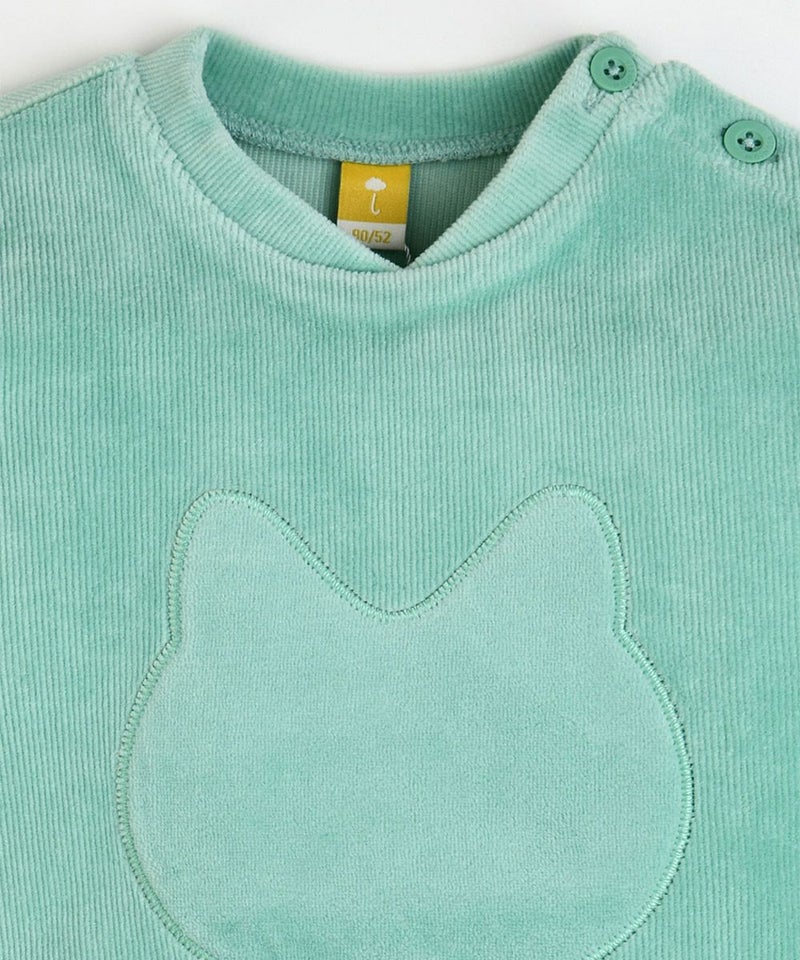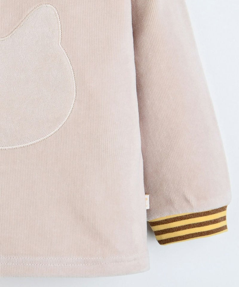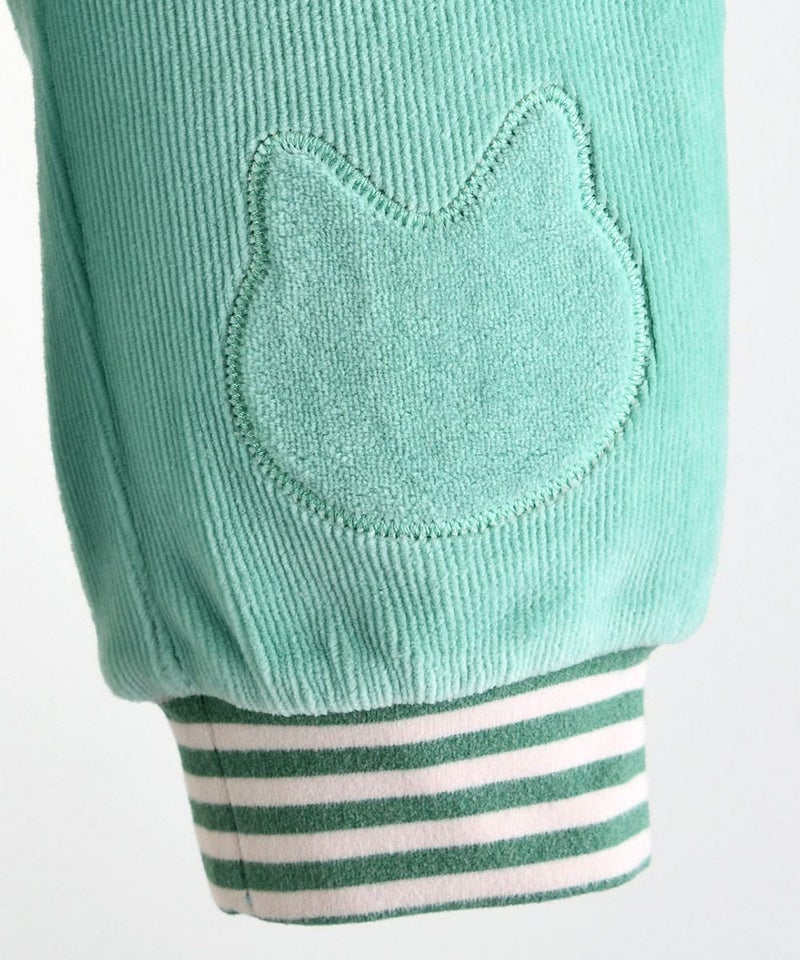 やわらかい着心地のベロアリブを使用した長袖トップスとロングパンツのセット。フロントのネコのミャオ(meow)刺繍がポイントで、袖と裾はカラーボーダーの配色がアクセントに。トップスとボトムス共にゆったりフィットでシンプルながらもカジュアルコーデとして、男の子_女の子どちらにもぴったりなセットアップです。※サイズによって脱着の為のボタン開閉があります。