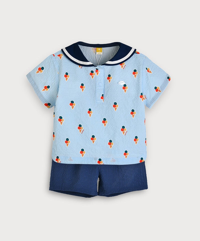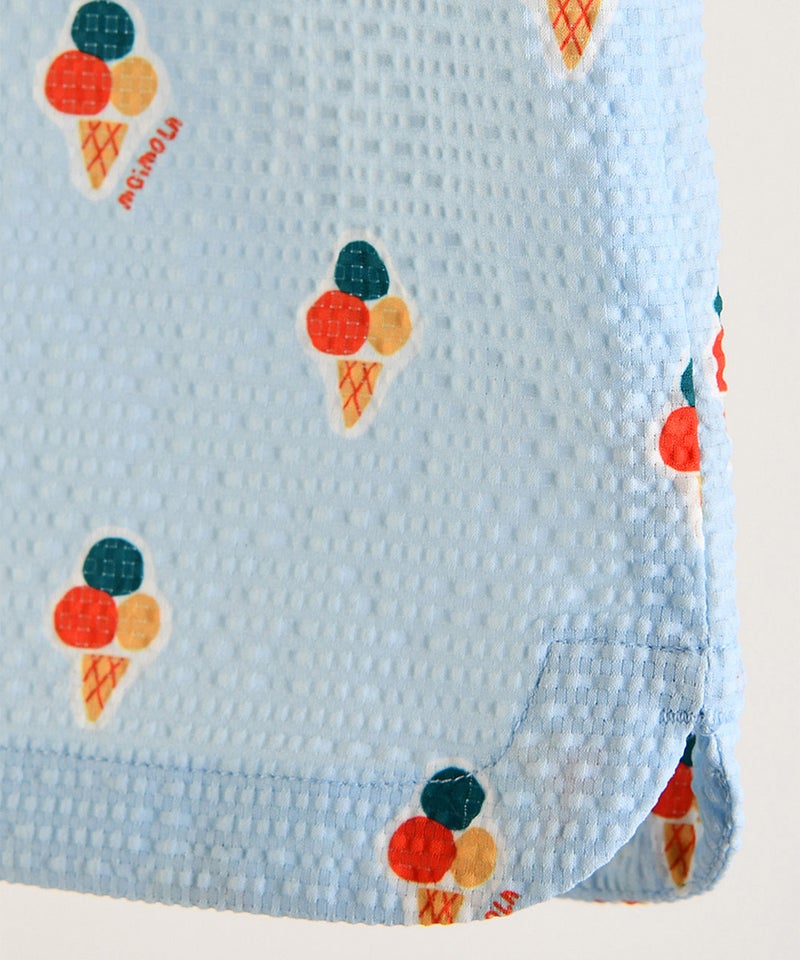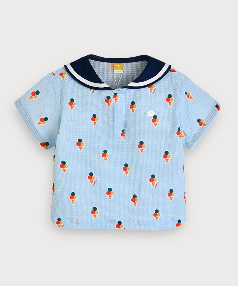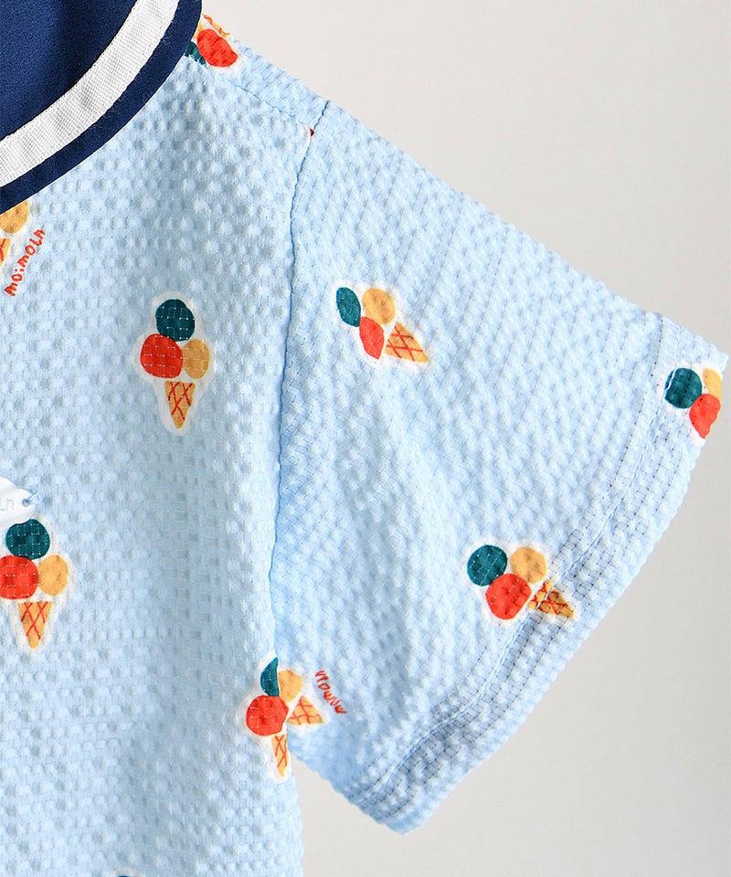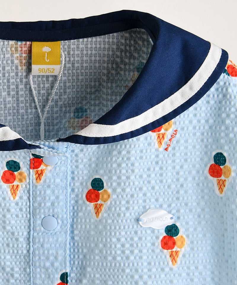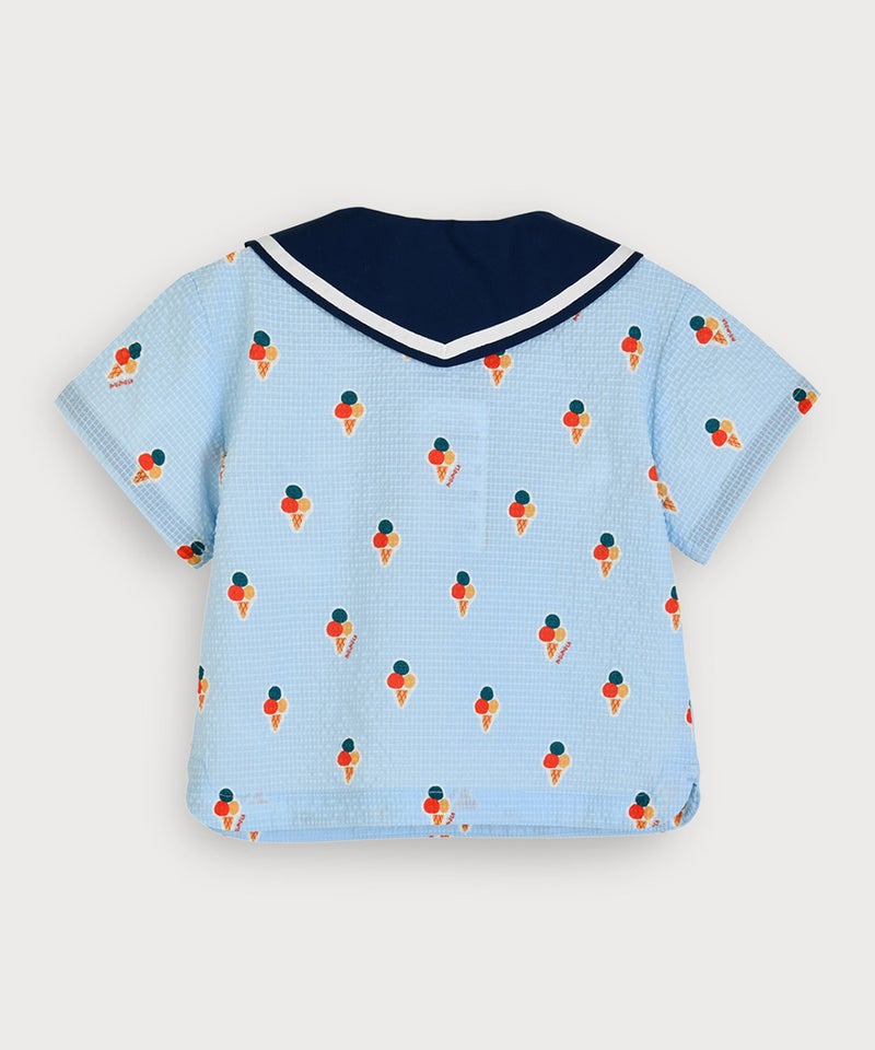 今シーズンのテーマアイコンである爽やかなアイス柄に大きなセーラーカラーがポイントの半袖トップスとショートパンツのセット。