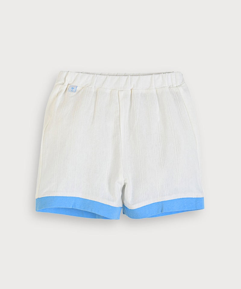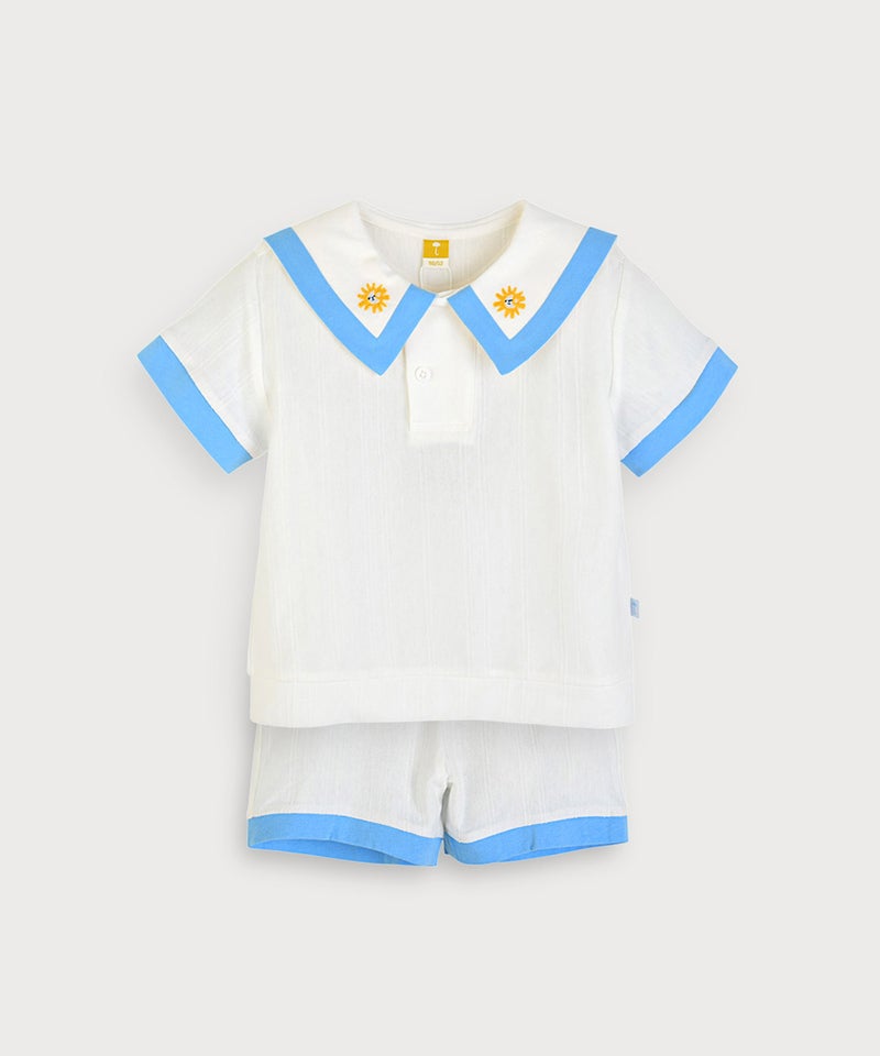 夏の青い空を思わせるブルーと太陽刺繍がポイントの半袖トップスとパンツのセット。