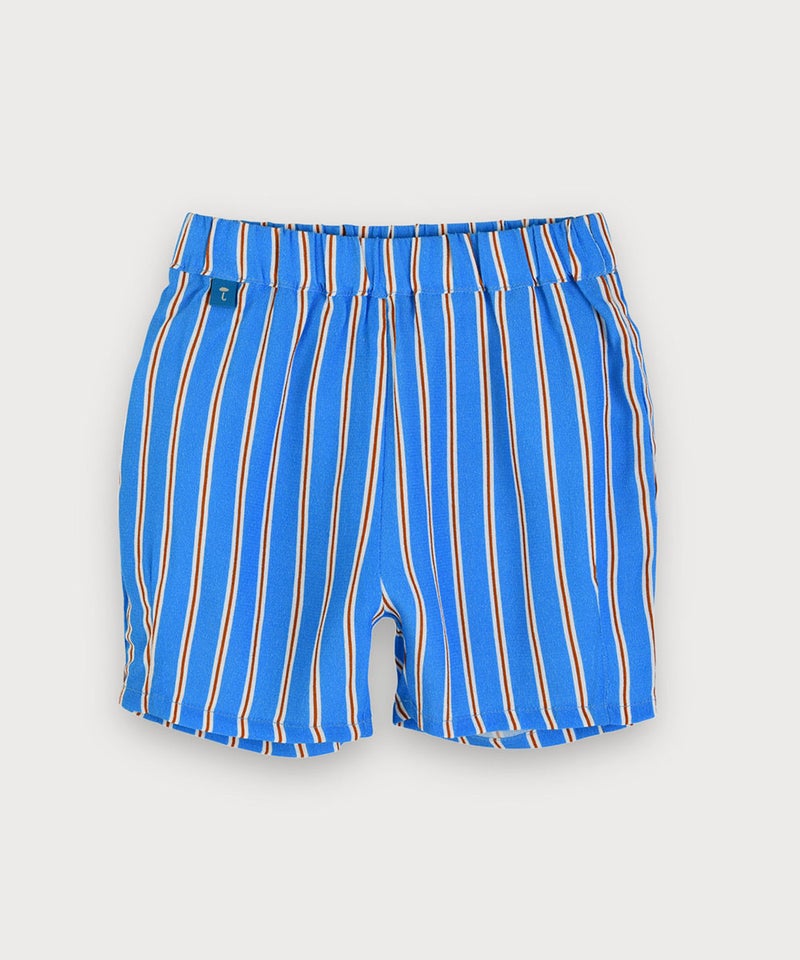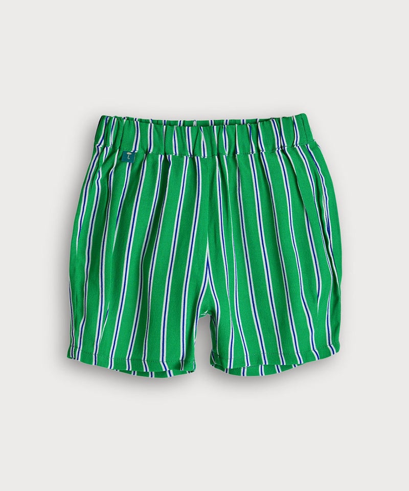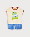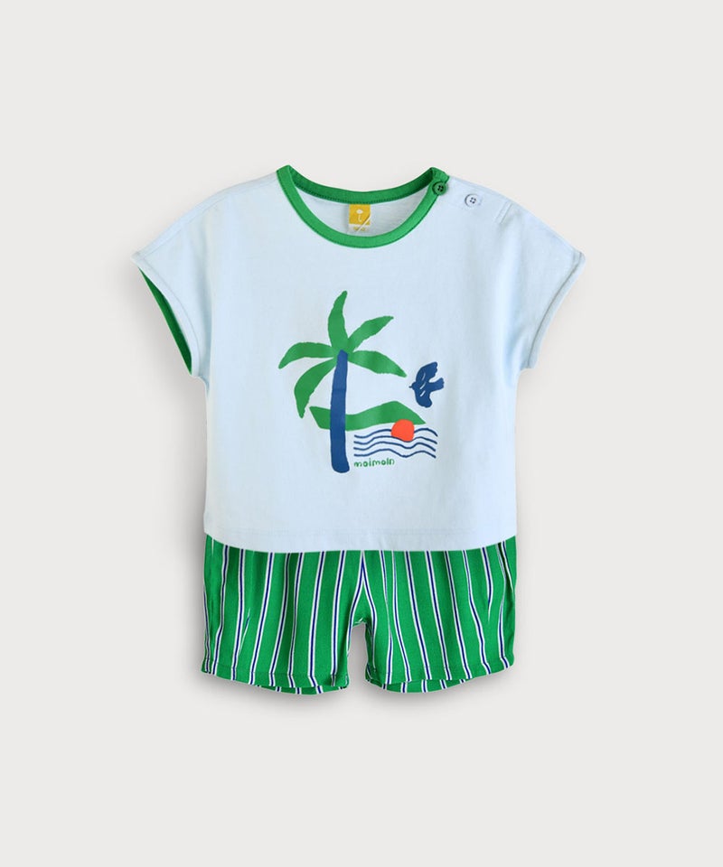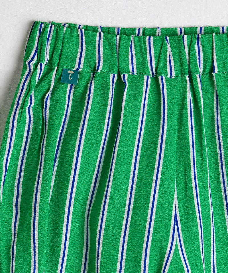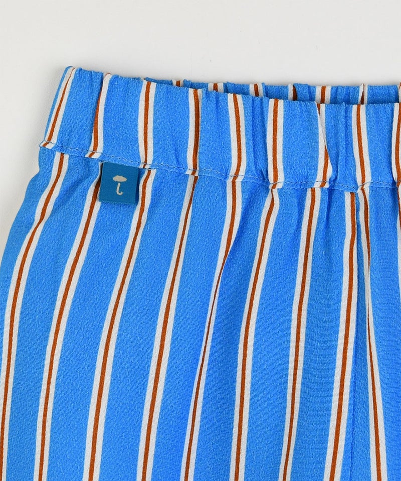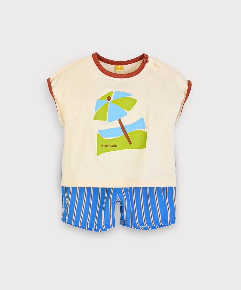 夏らしいプリントトップスとカラーストライプのパンツのセット。