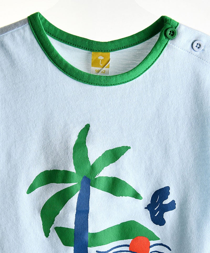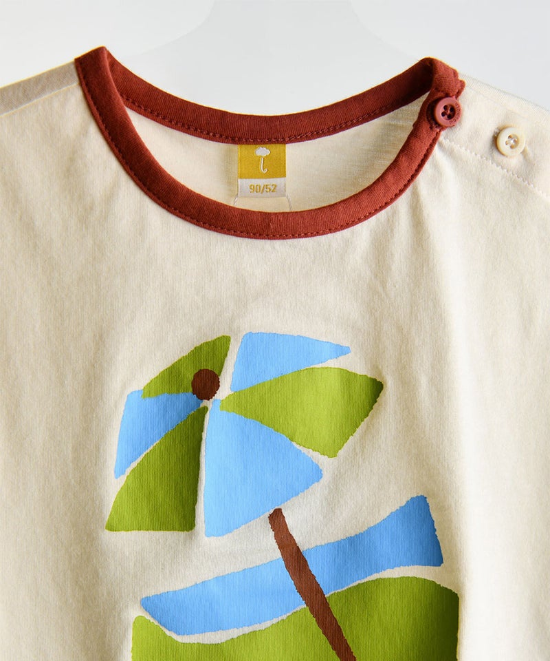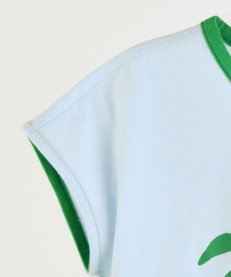 軽くて涼しい素材を使用し、真夏まで快適に着られる一着です。ノースリーブながら、ゆったりとしたシルエットで半袖のように着用できるデザインで、ボトムスはウエストゴム仕様で動きやすく、上下セットでコーディネートも簡単です。