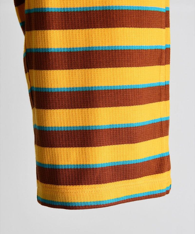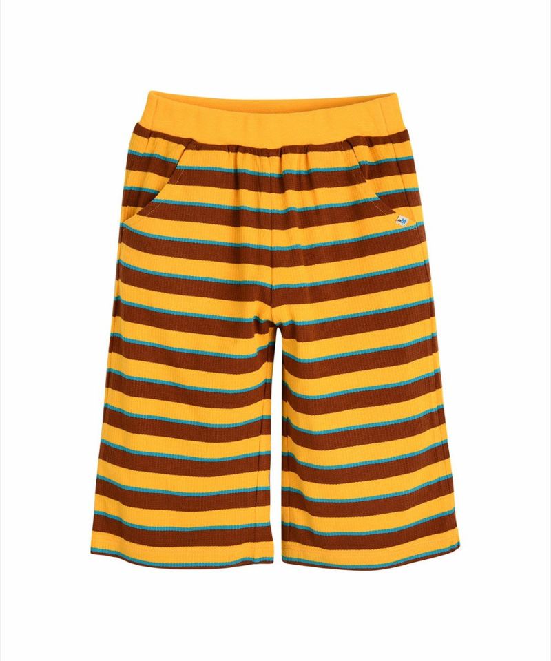 柔らかいレーヨン素材のストライプ柄セットアップ。さわやかなカラー配色ストライプとシーズングラフィックワッペンがポイントのアイテムです。