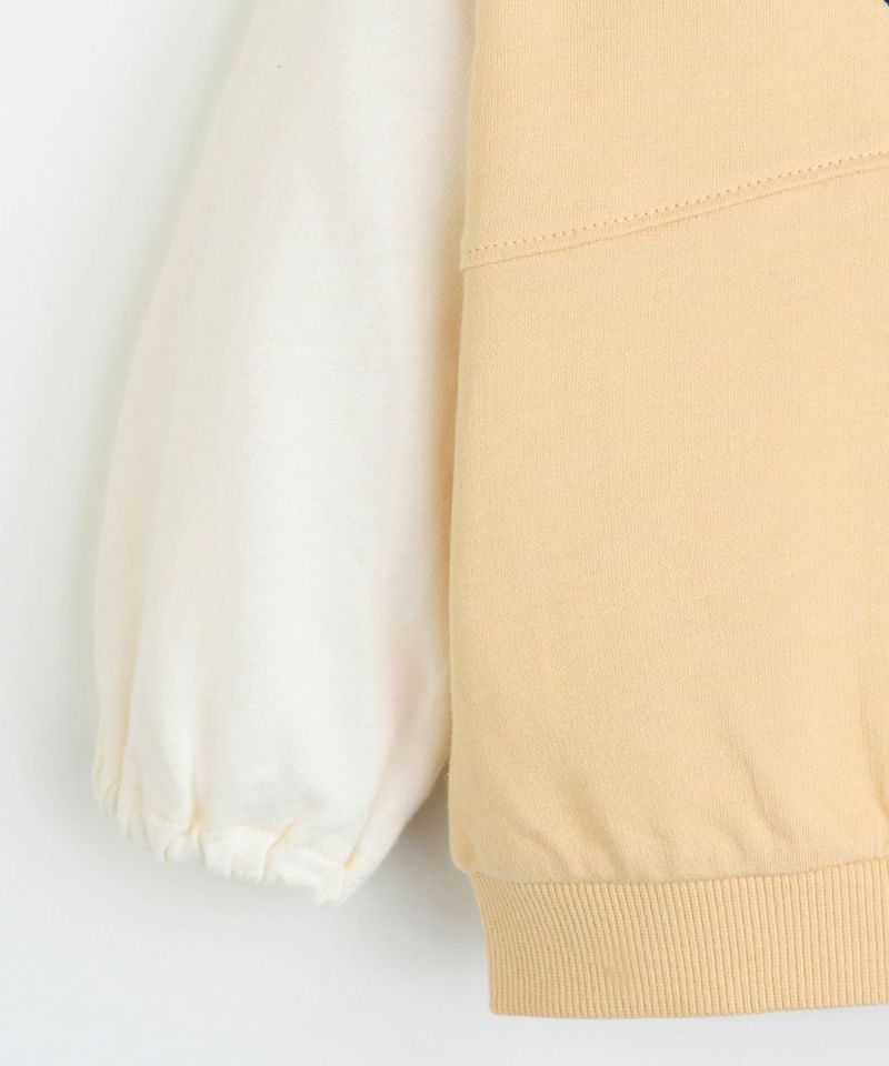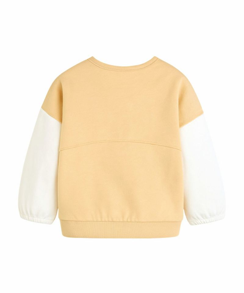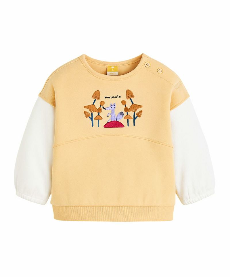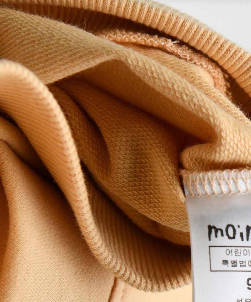 やわらかく肌触りの良い生地を使用した長袖トップス。落ち着いたベージュにアイボリーの配色、中央のキノコや、キツネのネロ、moimolnロゴの刺繍が秋らしいおしゃれな感性のデザイン。肩部分のボタンで脱着が簡単。内側にボタンガードを付け、肌への刺激を防止しています。