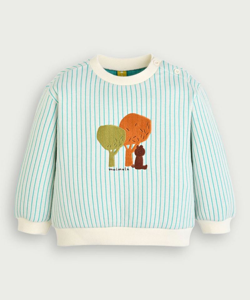 さわやかなカラーのストライプ柄がかわいい長袖トップス。ふわふわした三重地の生地で保温性と着心地を高めたアイテム。フロントにはシーズンムードが盛り込まれた木やクマのデリック(derick)の刺繍をプラスしています。※サイズによって首元に脱着用のボタン開閉があります。同じストライプ柄で、カバーオール(M254ROB04P)もございます。