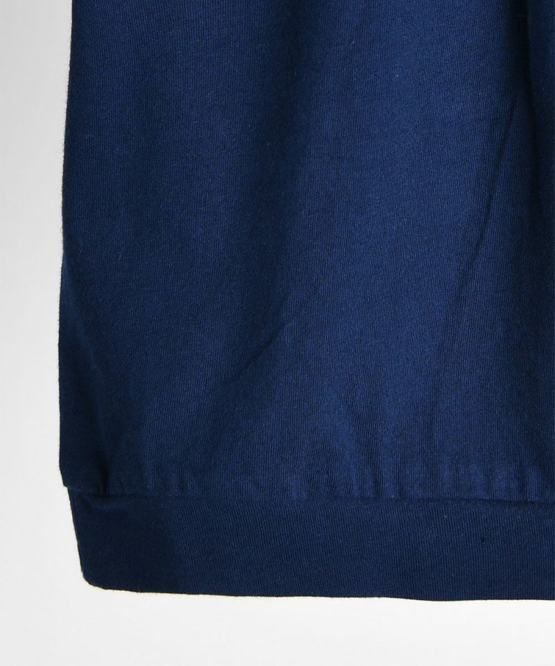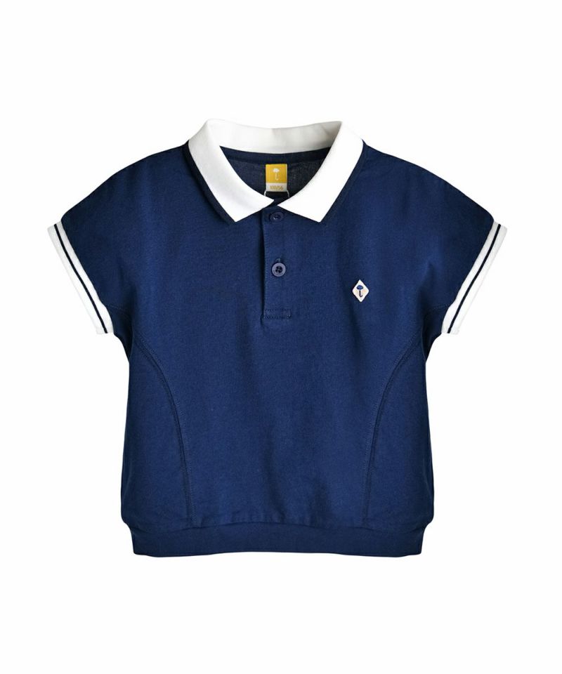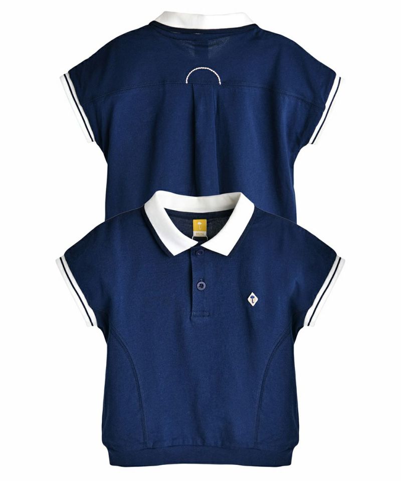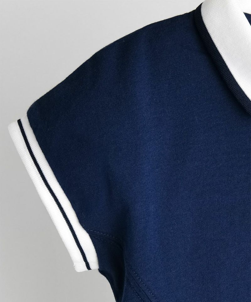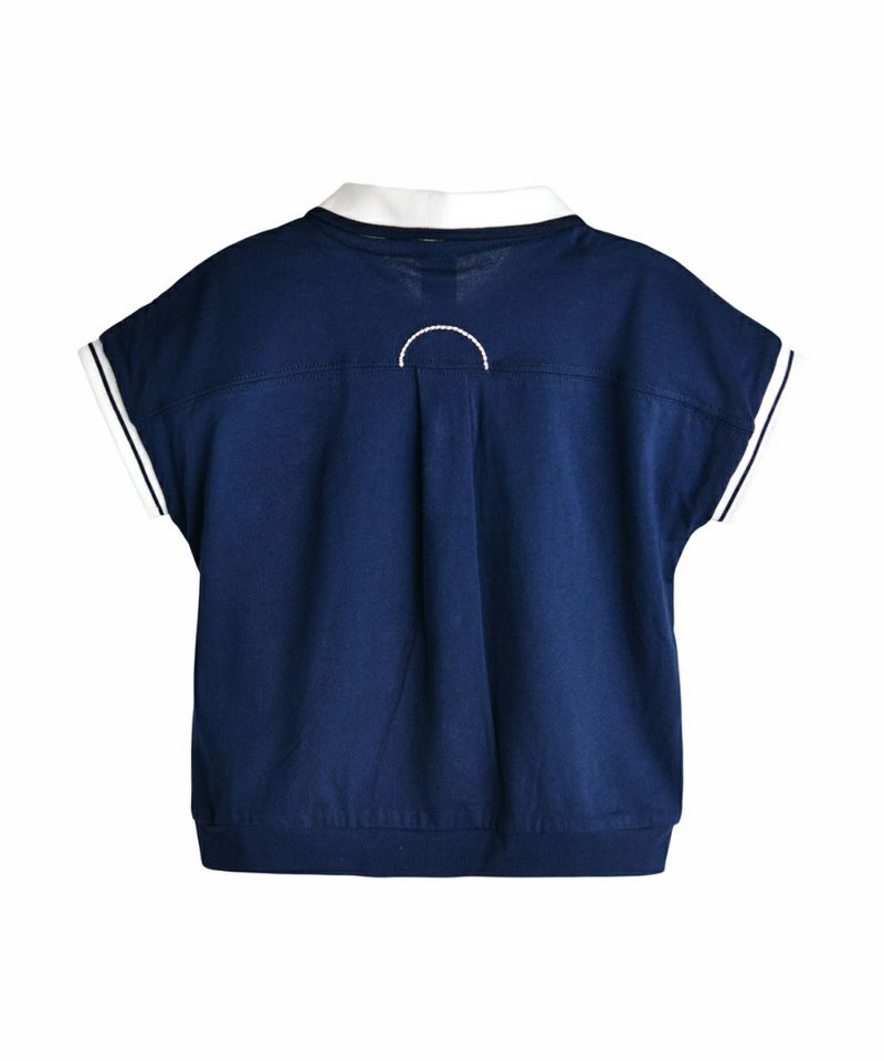 ネイビーカラーが清楚な印象を与える襟付きトップス。柔らかい素材で着心地の良さもポイントです。