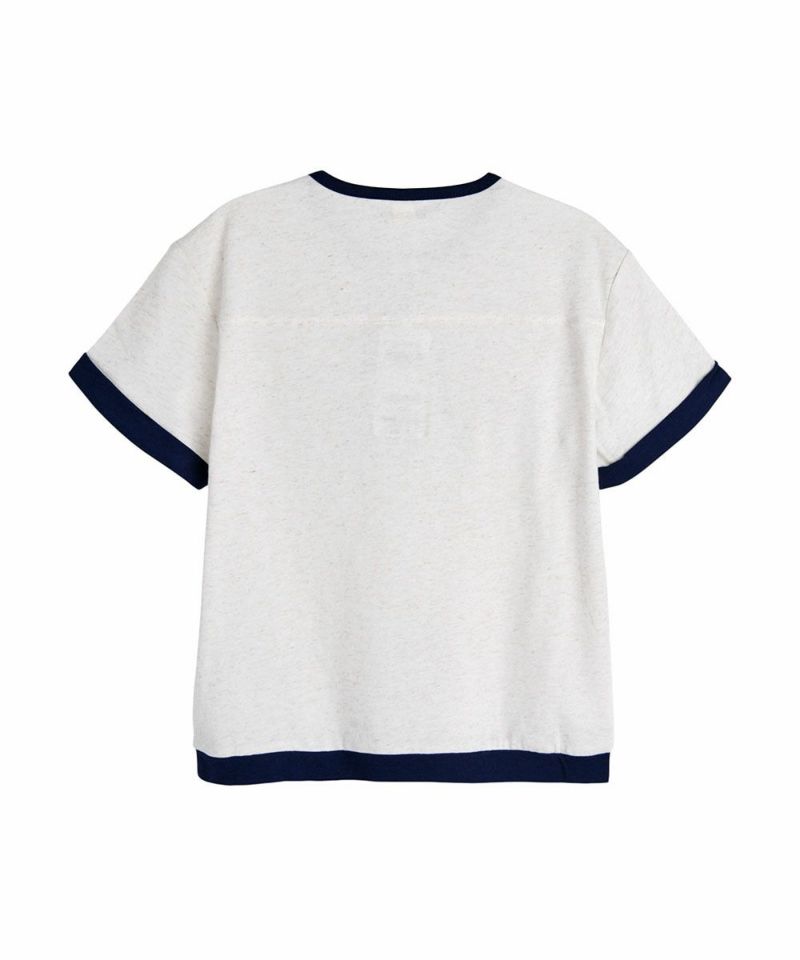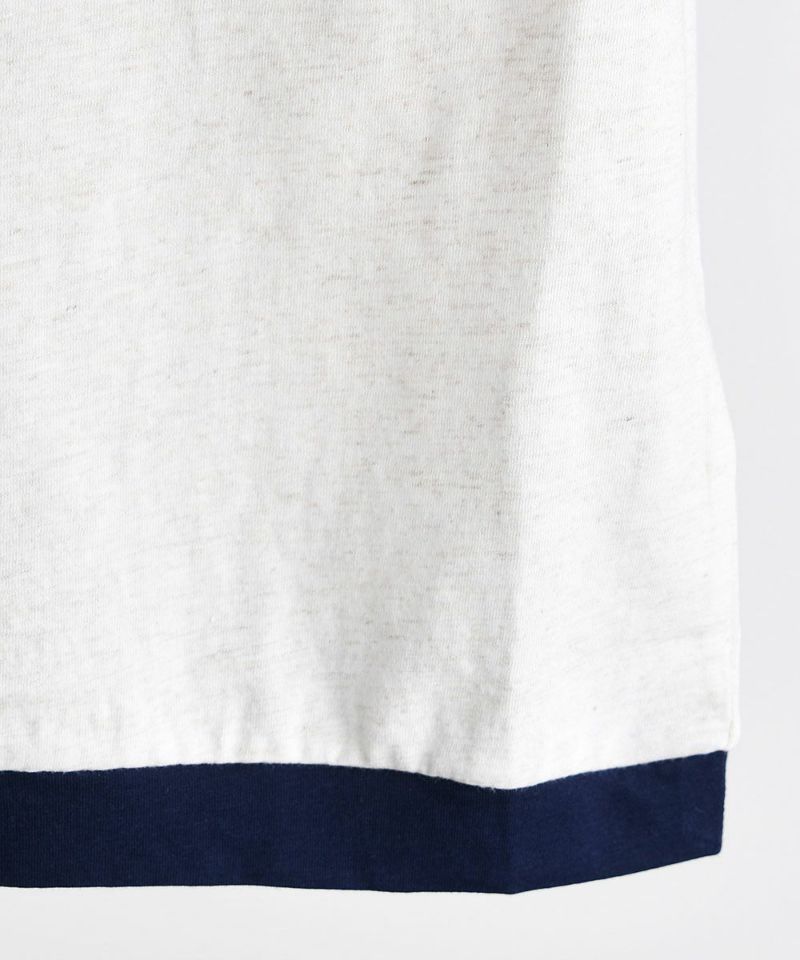 リネンが入った通気性に優れたトップス。霜降りのようなベース素材にネイビーとの配色が涼し気な1枚。フロントのワッペンがポイントです。