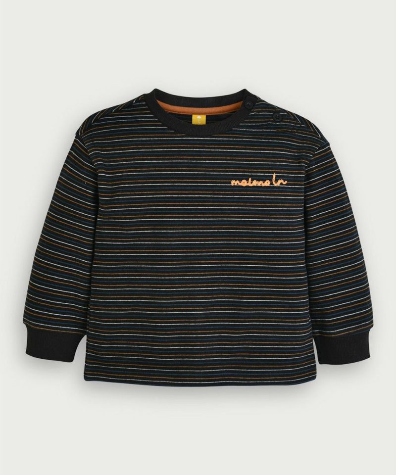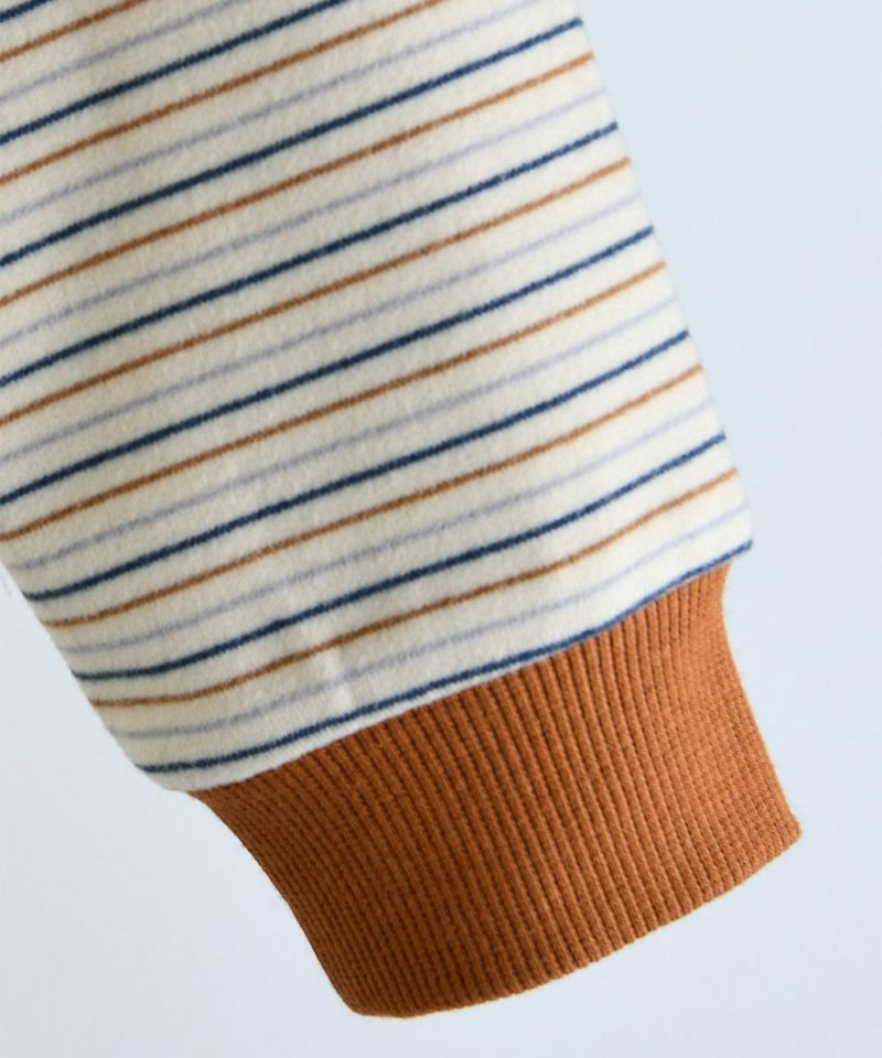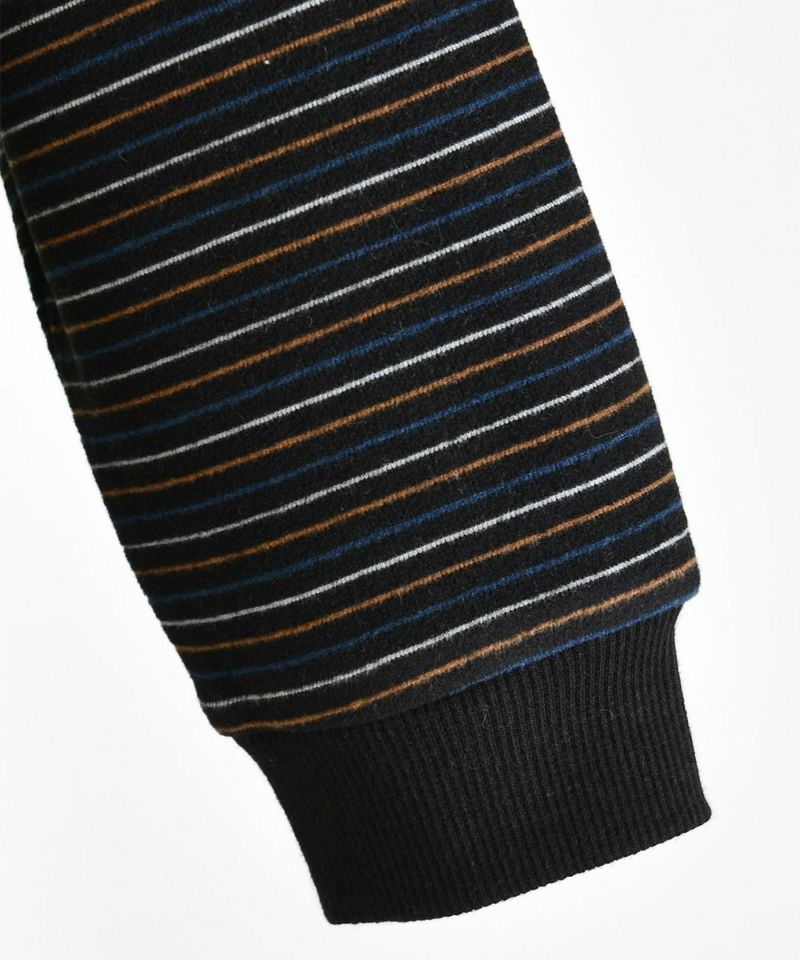 冬にぴったりの素材感で作られた細ストライプ柄の長袖Tシャツ。ふんわりとしたポリエステル素材の表側と裏側ともに弱い起毛で軽くて暖かく着ることができ、様々なボトムスとコーディネートしやすいアイテム※サイズによって脱着の為のボタン開閉があります。