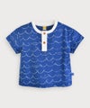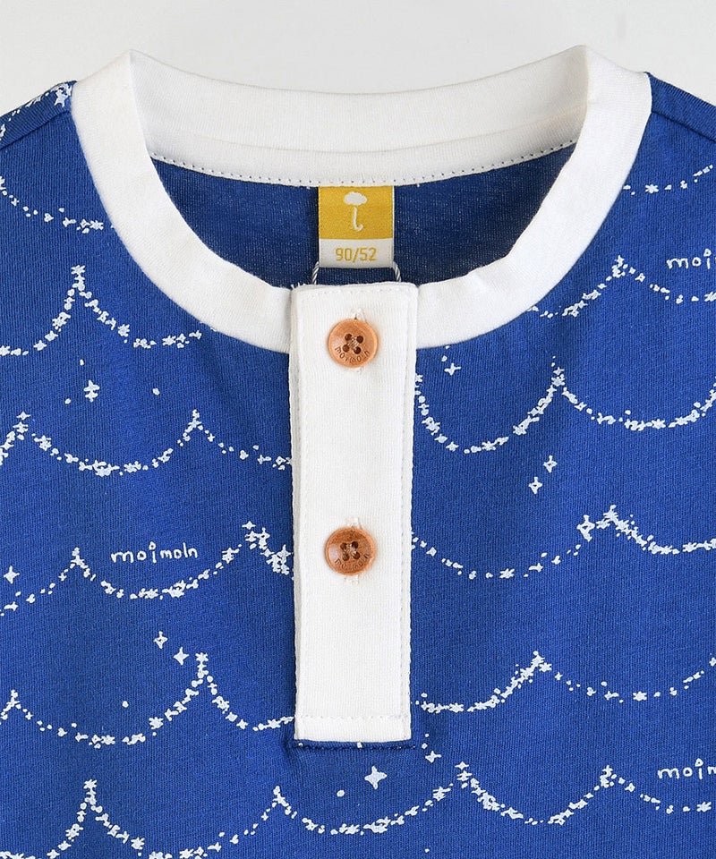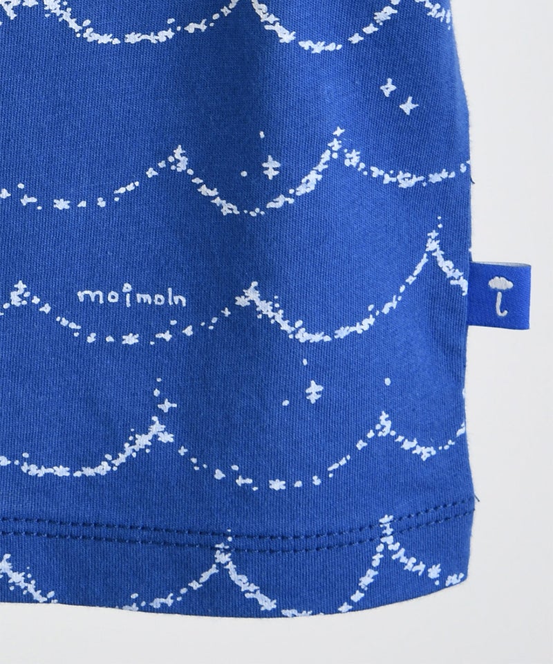 涼しげなブルーに白の波柄をあしらい、夏らしい爽やかな印象に仕上げています。フロントのホワイト配色と木製ボタンがアクセントとなり、ナチュラルな雰囲気をプラス。