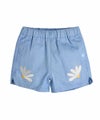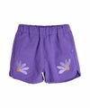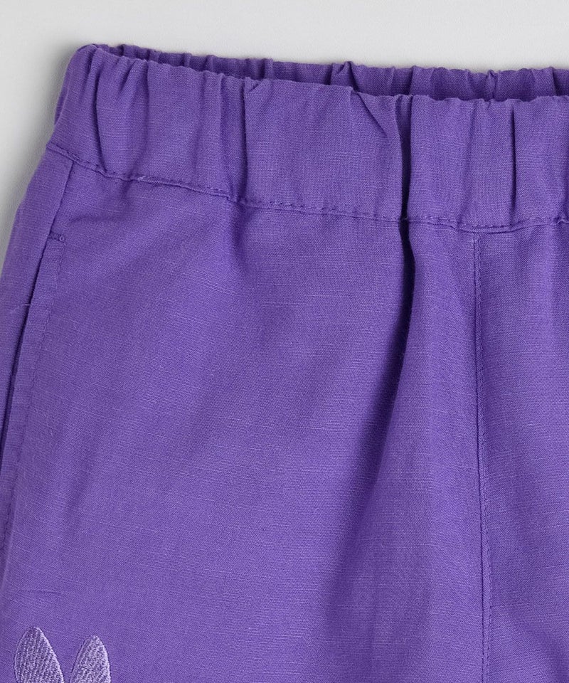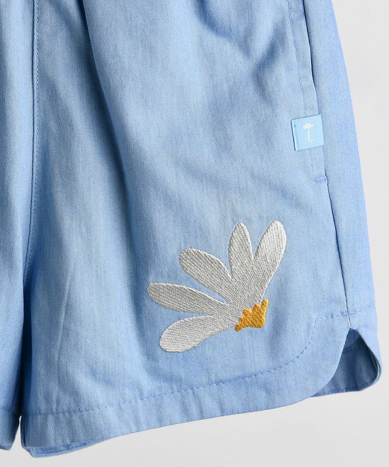 軽くて涼しい素材感の4分丈のパンツ。コーディネートしやすい薄色デニムのカラーと落ち着いたおしゃれな紫色の2色展開。パンツ左右下のビッグフラワー刺繍がポイントで、ゆったりとしたシルエットで活動性が良く、裾のスリット部分を丸く処理することでかわいいスタイルを演出したアイテムです。