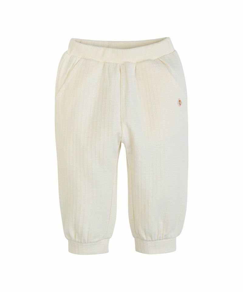 高級感あるジャカード生地を使用したリブ付きロング丈パンツ。フロントは両側にポケット、後ろのポケットにはラベルとレースが施され、ウエストゴムがしっかりしていて元気なお子様にもぴったり。シンプルながらもカジュアルになりすぎず、どんなトップスともコーディネートしやすいパンツです。