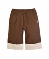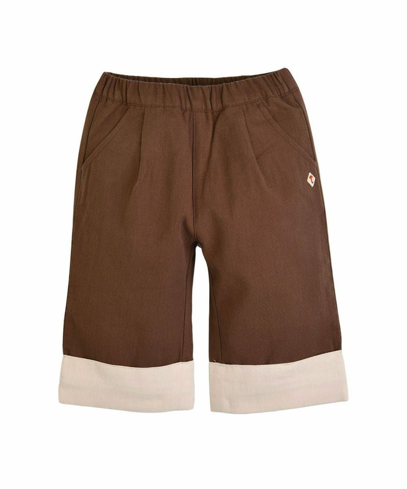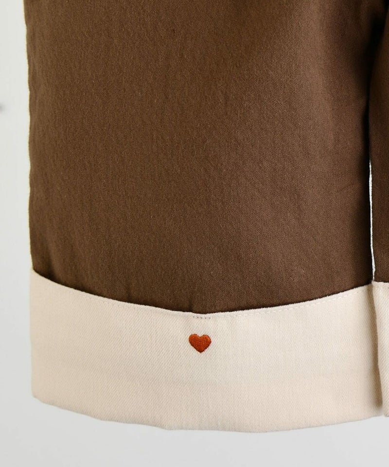 落ち着いたブラウンにクリーミーなベージュのロールアップがポイントの9分丈ワイドパンツ。後ろのロールアップ部分に小さなハートの刺繍を施してみたり、フロントの両ポケットの片方にはブランドロゴの刺繍を付けたりと遊び心もあります。ワイドフィットで着心地も良くウエストゴムなので活動性も良いアイテムです。※ヒップの2か所は飾りポケットです。