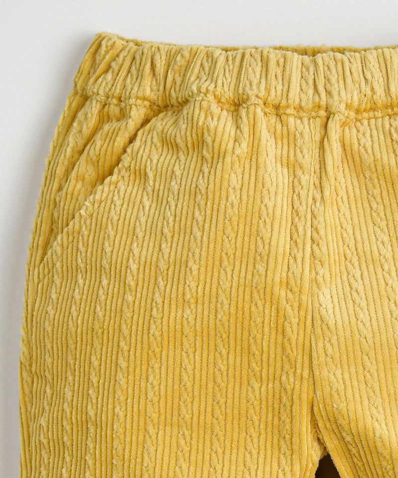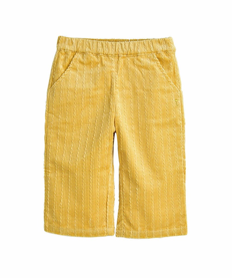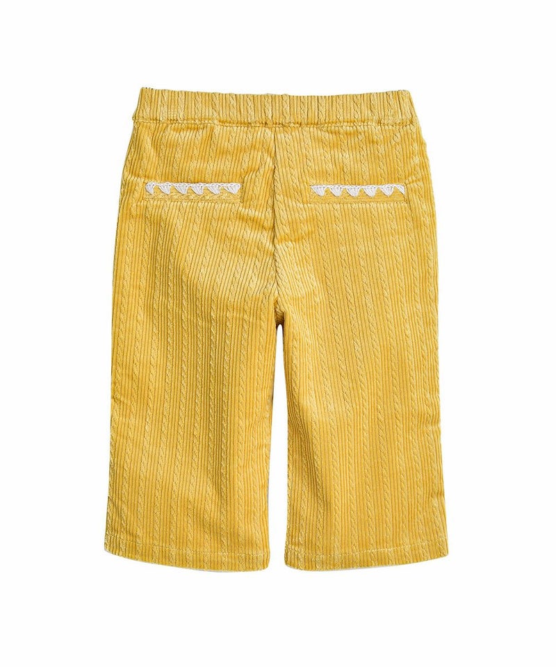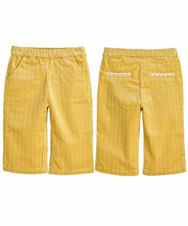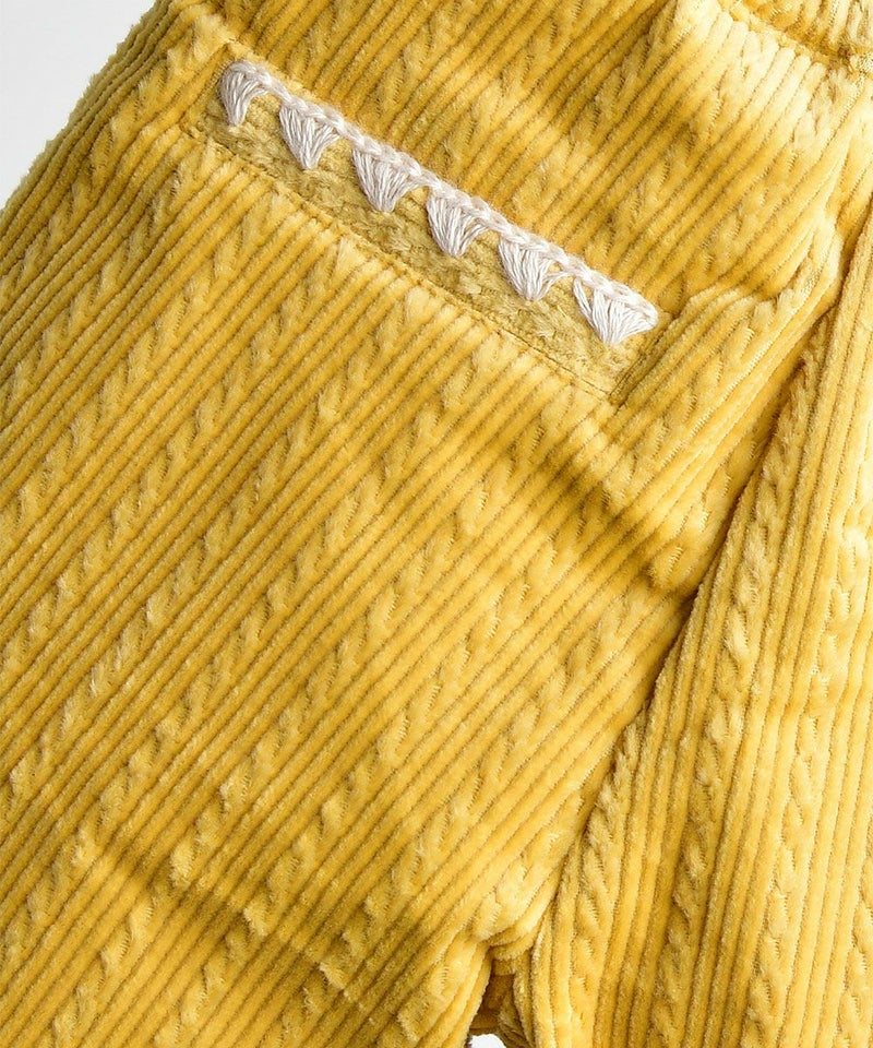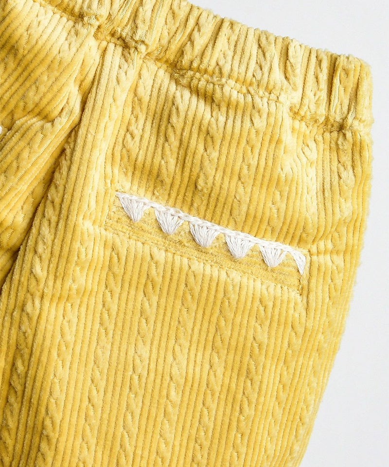 ねじれ模様のコーデュロイと、後ろのユニークな刺繍がポイントのストレートパンツ。伸縮性が良く、明るいカラーでコーディネートにポイントを与えるアイテムです。