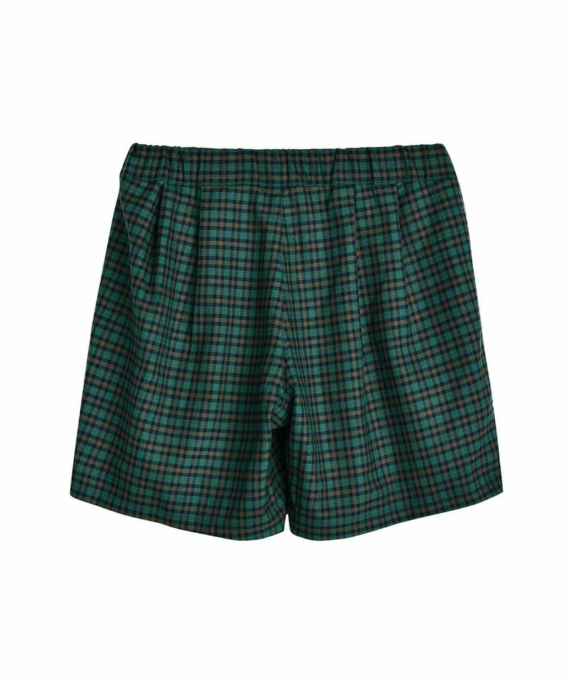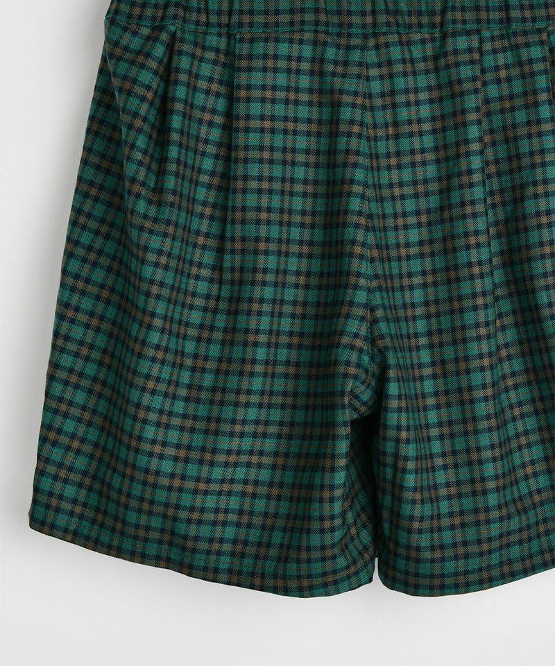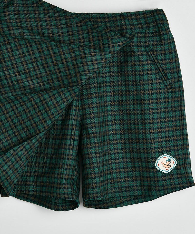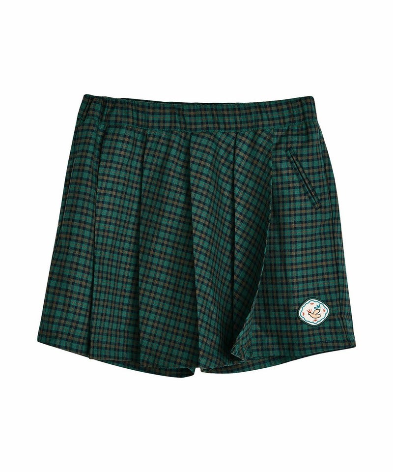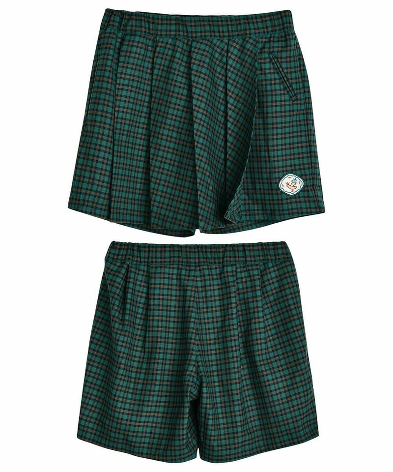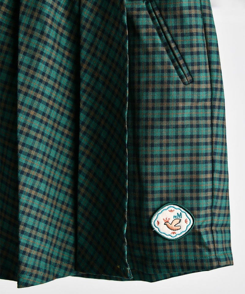 クラシカルなチェックが高級感あふれる4分丈スカートパンツ。鮮やかな青グリーンとかわいいワッペンがアクセントで、プリーツスカートの女の子らしいシルエットと動きやすさが売りのパンツのそれぞれの良い所を採用したデザイン。スウェットトップスやベストなどに合わせるとプレッピースタイルを楽しめるアイテムです。