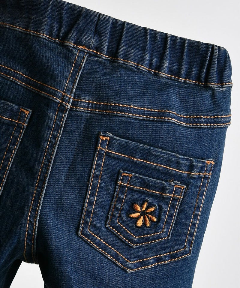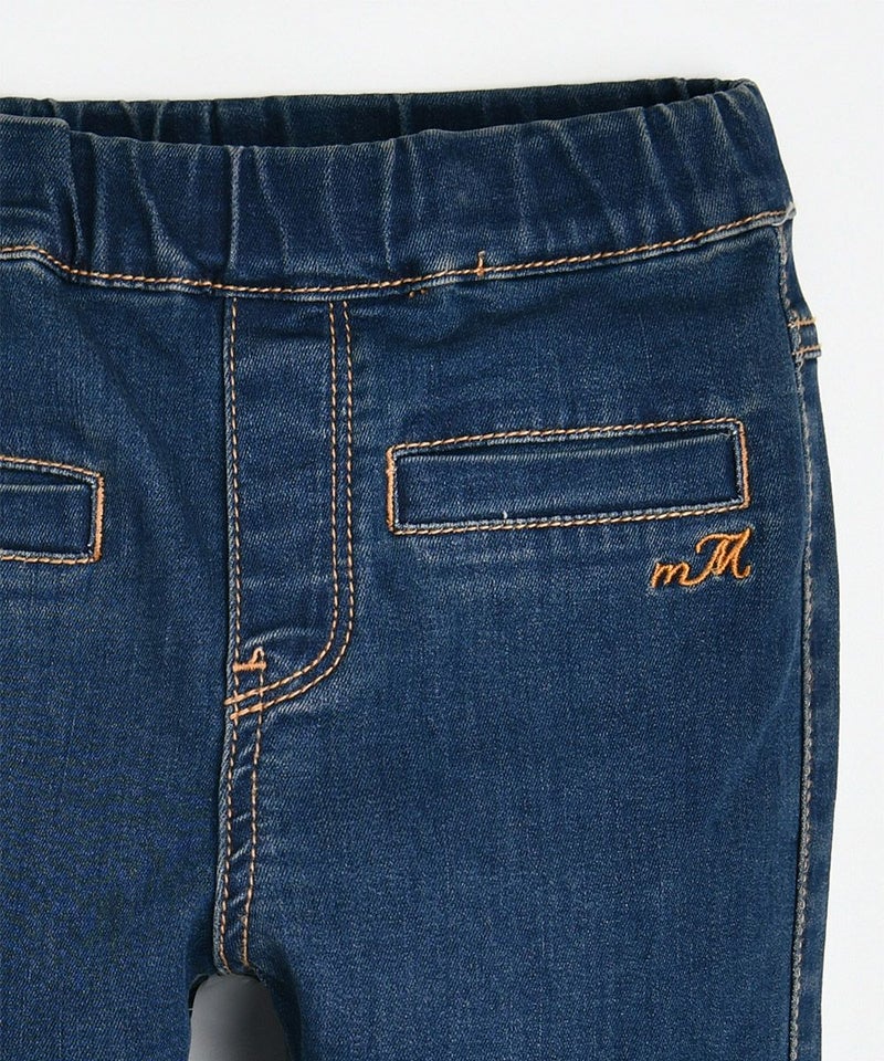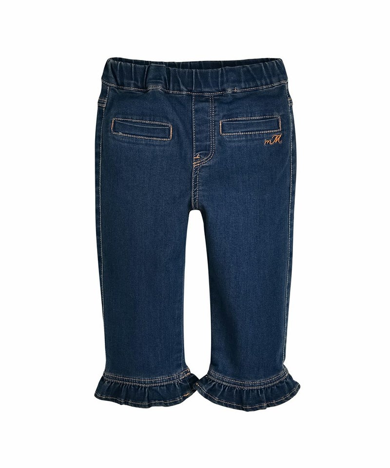 ストレッチデニム素材のディープブルーデニムパンツ。キャメルステッチを加えクラシカルな雰囲気を演出し、セミワイドフィットとラブリーな裾フリルがポイントのアイテムです。