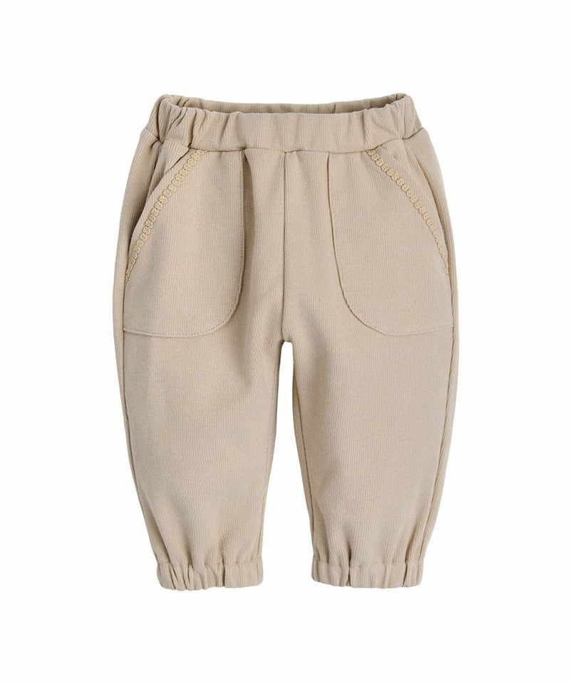 柔らかく伸縮性のあるジョガーパンツ。ポケットの口の丸レースがポイントで、スウェット地のため着用しやすいアイテムです。
