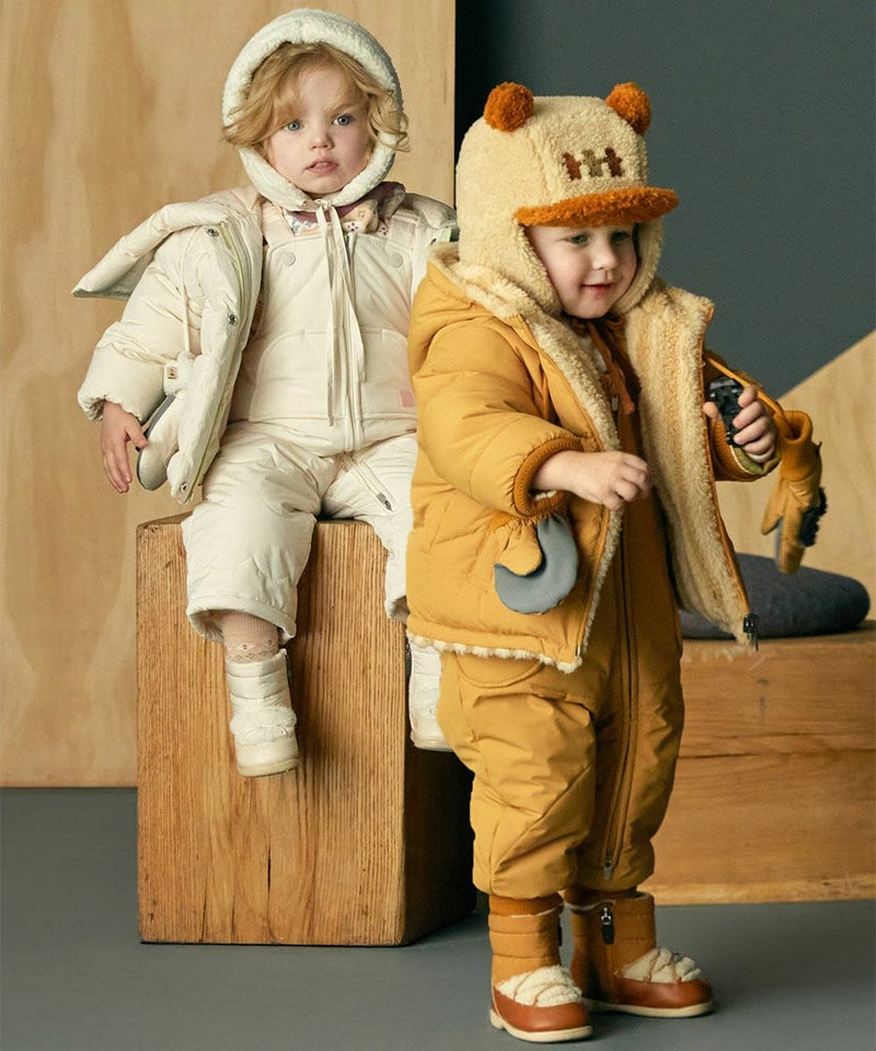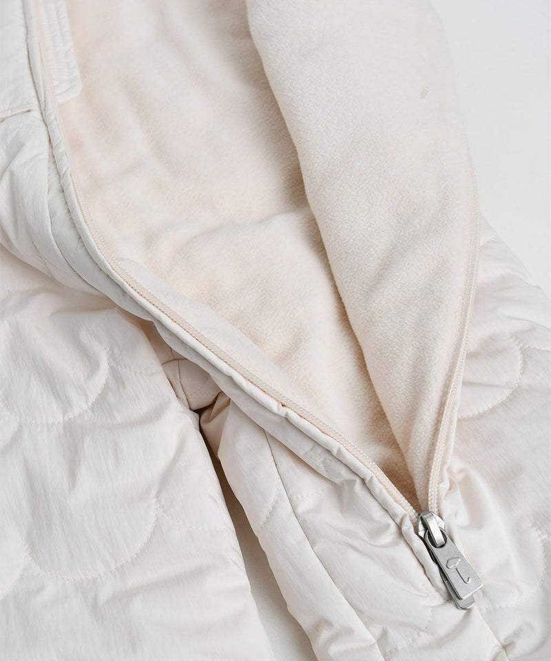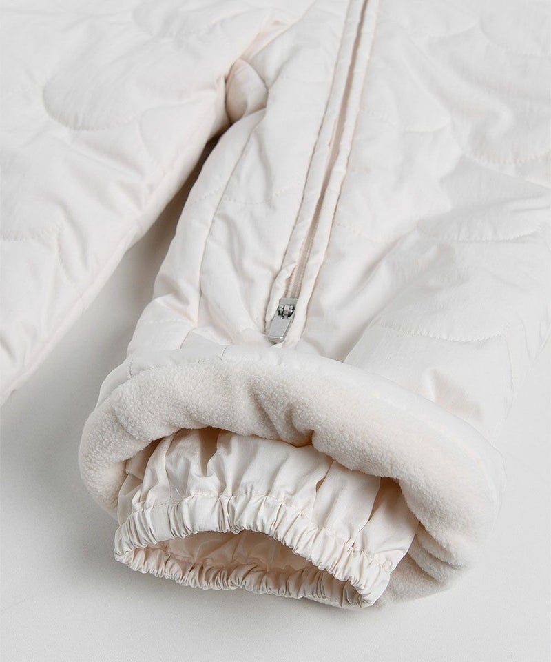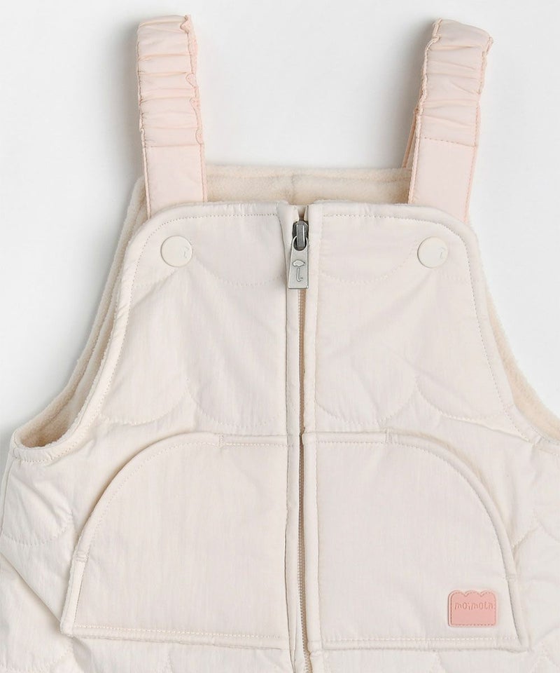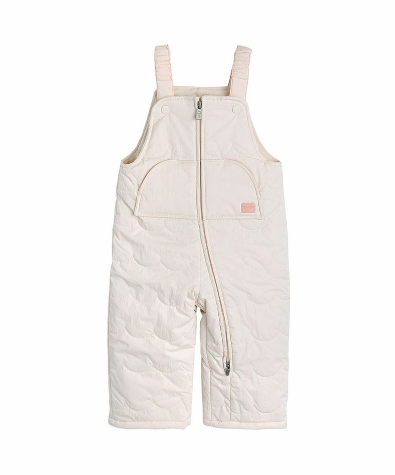ユニークな形のキルティングの防寒オーバーオールパンツ。裏地がフリース素材のため保温性が高く、カンガルーの袋のような前ポケットがポイントで、防水コーティングされているためスキーや雪遊びなどの屋外スポーツ時にも活用度の高いアイテムです。