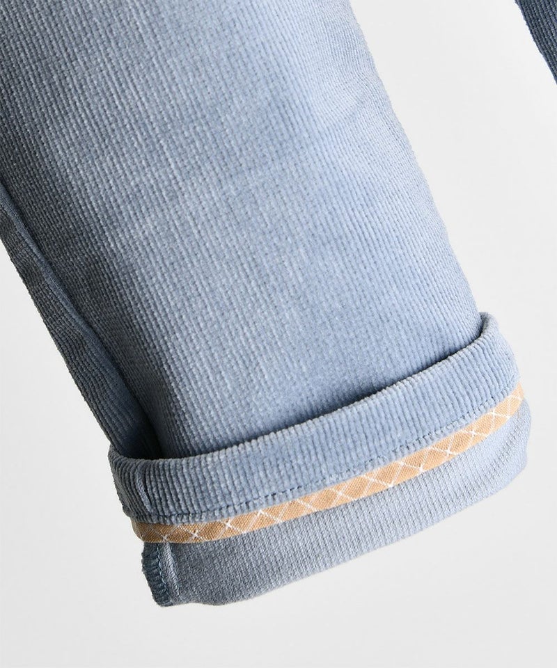 ゆったりとしたストレートフィットのコーデュロイパンツ。小さな飾りポケットがユニークで、シンプルなブルーカラーなので、マルチコーディネートしやすいアイテムです。