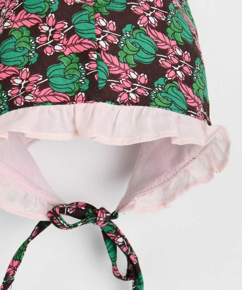ユニークなフラワープリントのカバーオール。帽子と襟のフリルがポイントのアイテム。(W242OPB57P)と姉妹ルックとしておすすめします。