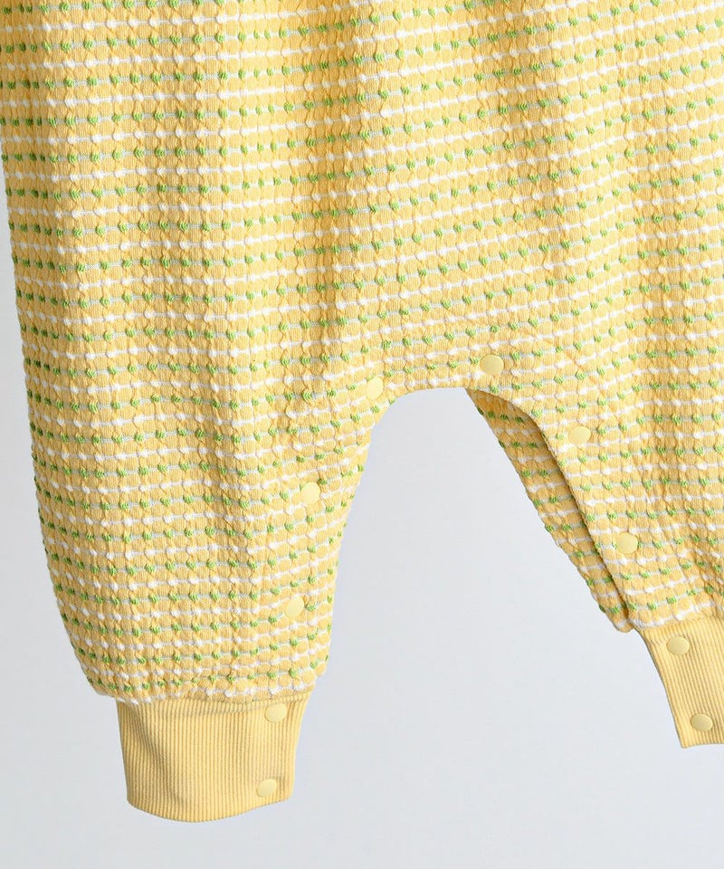 イエローとグリーン配色の可愛いジャカードが特徴のカバーオールセット。丸いレースの様な襟の形に沿ってポイント刺繍を入れたアイテム。帽子がセットになっているので、プレゼントにもおすすめです。